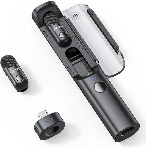 BOYA Magic 05 zestaw, bezprzewodowy system audio do smartfonów 2x mikrofon, USB-C, 2.4 GHz, 24-bit (czarny)Dzięki konstrukcji 4 w 1 bezprzewodowy system mikrofonowy BOYA Magic dla 2 osób zapewnia twórcom treści maksymalną wszechstronność podczas nagrywania wywiadów, vlogów lub podcastów. Charakterystyka 2 nadajniki z wbudowanymi mikrofonami etui ładujące pełni funkcję mikrofonu ręcznego redukcja szumów AI podłączany odbiornik USB-C zasięg transmisji 100m tryby Safety Track i Smart Limiter 6 godzin pracy baterii nadajnika, 30 godzin dodatkowego czasu pracy dzięki etui ładującemu nadajniki z klipsem, etui ładujące pełniące również funkcję mikrofonu ręcznego odbiornik USB-C do podłączenia do urządzeń mobilnych rejestracja dźwięku 48 kHz 24 bity -40 dB redukcja szumów AI parowanie jednym dotknięciem System składa się z dwóch nadajników z klipsem, odbiornika z wtyczką USB-C oraz etui ładującego, które pełni funkcję ręcznego mikrofonu dla całego systemu. Etui można wykorzystać jako profesjonalny mikrofon ręczny podczas wywiadów z przechodniami na ulicy, zamocować na górnej części klatki aparatu jako mikrofon kierunkowy lub przymocować do mini statywu, aby używać go jako mikrofonu stacjonarnego. Komponenty mogą komunikować się ze sobą z odległości do 328 stóp za pośrednictwem częstotliwości 2,4 GHz. Nadajniki są wyposażone w wbudowane elementy sterujące, które umożliwiają przełączanie funkcji redukcji szumów AI do 40 dB. Podwójne tryby bezpiecznego nagrywania — ścieżka bezpieczeństwa 12 dB i inteligentny limiter — zapewniają spokój ducha podczas filmowania w nieprzewidywalnych sytuacjach. Same nadajniki są wyposażone w baterie 90 mAh, które zapewniają 6 godzin pracy systemu. W połączeniu z etui ładującym żywotność baterii systemu wydłuża się do 30 godzin, co pozwala na długie dni zdjęciowe. Zawartość zestawu 1x bezprzewodowy system mikrofonowy BOYA Magic dla 2 osób z złączem USB-C do urządzeń mobilnych (2,4 GHz) 2x nadajnik 1x odbiornik podłączany (USB-C) 1x etui ładujące 2x magnes 2x futrzana osłona przeciwwietrzna (nadajnik) 1x futrzana osłona przeciwwietrzna (etui ładujące) 1x piankowa osłona przeciwwietrzna (etui ładujące) 1x kabel danych USB-C do USB-A 1x torba do przechowywania