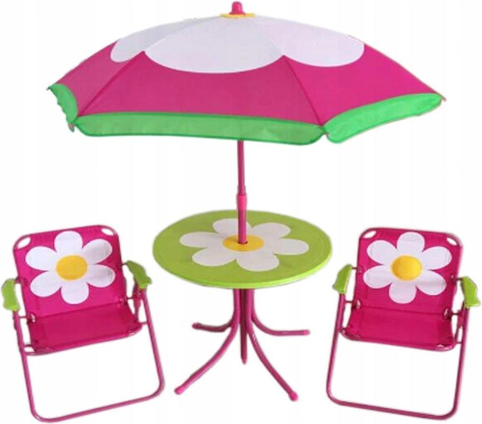 47698 Komplet mebli dla dzieci Kwiatek PATIO Zestaw dziecięcy campingowy 4-elementowy z motywem kwiatka zawiera stalowy stelaż krzeseł malowany proszkowo, plastikowy system bezpiecznego blokowania składania krzesełek, oraz siedziska i oparcia z tkaniny poliestrowej. Blat stołu wykonany z tworzywa sztucznego, stalowy stelaż malowany proszkowo. Parasol posiada stalowy stelaż malowany proszkowo oraz czaszę z tkaniny poliestrowej. W skład zestawu wchodzi stół, parasol oraz 2 krzesełka z motywem motyla. Produkt spełnia normę EN71-1/2/3 i jest zgodny z wymogami europejskiego REACH. Wymiar krzesła: 29 x 29 x 52 cmŚrednica stołu: 50 cmWysokość stołu: 47.5 cmŚrednica czaszy: 110 cmMaksymalne obciążenie krzesełka: 30kg.Maksymalne obciążenie stolika: 20kg. Marka: Patio Głębokość [cm]: Liczba osób: 2 Materiał: Poliester,Stal,Tworzywo sztuczne Funkcja: Rozkładane Kolor: biały,różowy,zielony,żółty Wzór: motyw roślinny Skład materiałowy: 100% poliester