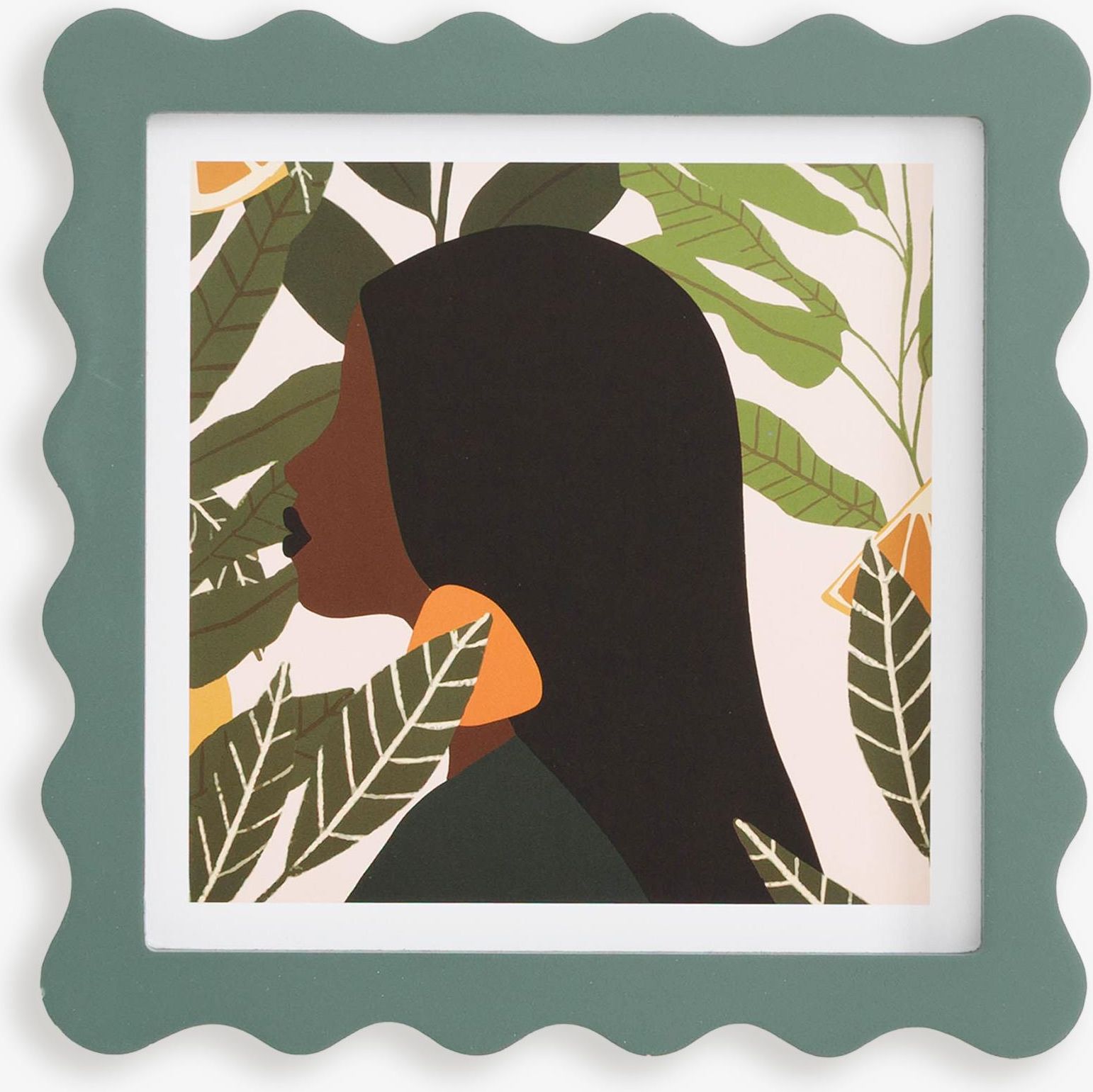 Kompozycja w ciepłych, ziemistych barwach. Sylwetka kobiety wśród liści przyciąga wzrok spokojem i naturalnością. Zielona rama podkreśla roślinne motywy i nadaje całości przyjemny, organiczny charakter. Całość otoczona jest ozdobną, falistą ramką w kolorzezielonym, co nadaje pracy delikatny, nieco retro lub vintage klimat. Styl tendobrze pasuje do wnętrz w duchu boho, naturalnym lub klasycznym. Format 20 × 20 cm - idealny do małych przestrzeni. Roślinna oprawa graficzna - subtelna i wyważona. Ozdoba do kącika relaksu, przedpokoju lub domowego biura.