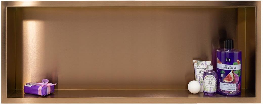 Półki wnękowe – WALL-BOX ONE 90x30x7 – Copper (Miedź) Półki wnękowe WALL-BOX ONE Copper – To sposób na modne i stylowe wykończenie łazienki. Odcienie miedzi doskonale prezentują się w łazienkach w stylu retro, rustykalnym, vintage czy też industrialnym. Idealnie tworzą duet z surowym betonem, marmurem i drewnem. Półki wnękowe w kolorze miedzi nadają wnętrzu elegancji, szlachetności i delikatności. WALL-BOX ONE Copper – odmieni oblicze najskromniejszej i najbardziej surowej łazienki. Szlachetny odcień tego metalu pomaga zbudować we wnętrzu atmosferę luksusu WALL-BOX ONE Copper pozwala uporządkować przestrzeń w łazience i nada jej nowoczesnego designu. Na łatwo dostępnych półkach można ustawić kosmetyki, perfumy a w kabinie prysznicowej – szampony, żele i inne artykuły kąpielowe. Półki linii WALL-BOX ONE można także wykorzystać aranżując przestrzeń np. w sypialni w miejscu szafek nocnych – na podręczne drobiazgi, kuchni – na przyprawy, czy jako wnęki na elementy dekoracyjne w salonie. WALL-BOX ONE Copper to półki wnękowe, które pięknie wkomponowują we wnętrza industrialne typu współczesne lofty. Wykonany z wysokiej jakości stali nierdzewnej WALL-BOX ONE nie jest narażony na korozję związaną z wodą i wysoką wilgotnością panującą w łazience czy kuchni. Dwie głębokości montażu (7 i 10 cm) pozwalają na dobranie odpowiedniego modelu i dostosowanie do możliwości instalacyjnych. WALL-BOX ONE Copper można zamontować w większości ścian lub wnęk. Kołnierz otaczający WALL-BOX ONE jest dodatkową ozdobą, ale także ukrywa przycięte krawędzie glazury i stanowi elegancką ramę. WALL-BOX ONE Copper często nazywane są następcami koszyków łazienkowych, które zazwyczaj wykonane są z materiałów niskiej jakości, są mało estetyczne, ograniczają miejsce w kabinie oraz bardzo często korodują. WALL-BOX ONE Copper to również alternatywa dla półek wnękowych wykonywanych z płyt gipsowo-kartonowych. Płyty g/k nie są materiałem dedykowanym do wykonywania półek wnękowych a w szczególności tam gdzie mamy do czynienia z bardzo dużą wilgotnością (np: kabina prysznicowa). Półki wykonane z płyt g/k nie są wodoszczelne, co może powodować przeciekanie wody do wnętrza ściany poprzez wypłukujące się fugi. Wykonywanie tego typu półek jest bardzo kosztowne, problematyczne oraz pracochłonne. Półki wnękowe WALL-BOX ONE Copper to szybkie w instalacji i w pełni wodoszczelne gotowe rozwiązanie. Półki wnękowe WALL-BOX ONE COPPER – Zalety Wykonane z wysokiej jakości stali nierdzewnej – Powłoka PVD – Physical Vapour Deposition Nowoczesny wygląd Wodoszczelne Dostępne w kilku wersjach kolorystycznych, rozmiarach oraz głębokościach Łatwe i szybkie w montażu Uniwersalne zastosowanie – pod prysznicem, w łazience, salonie czy przedpokoju, itp. Wygodne w użytkowaniu Wpuszczane w ścianę – Nie zabierają miejsca w kabinie. Łatwe do utrzymania w czystości
