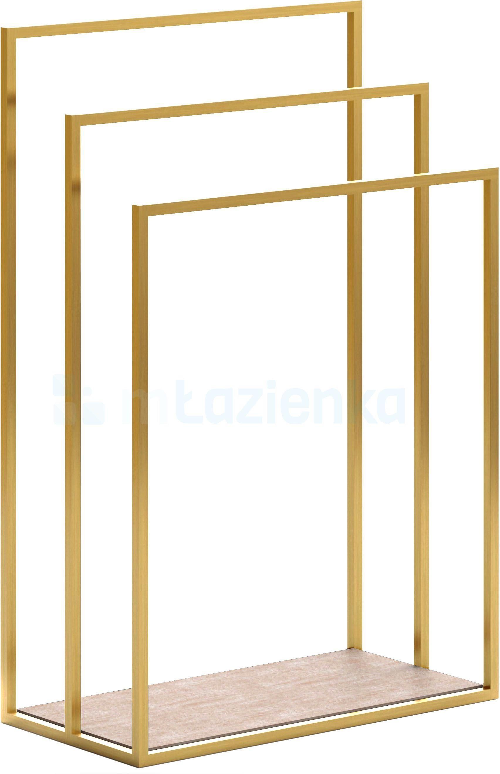 Stojący wieszak na ręczniki NJ-02 w stylu glamourNowoczesny wieszak na ręczniki JM-02 to wolnostojący wieszak na ręczniki, wykonany ze stalowych profili oraz drewnianej podstawy. Smukła konstrukcja oraz możliwość powieszenia kilku ręczników na raz sprawia, że idealnie sprawdzi się w małych łazienkach. Wytrzymała konstrukcja i staranne wykonanie ze stali powoduje, że będziemy mogli cieszyć się nim przez długi czas. Wieszak na ręczniki JM-02 charakteryzuje niebanalny design dostosowany do współczesnych aranżacji wnętrz w stylu glamour. Niezwykle użyteczny i funkcjonalny stojak na ręczniki będzie elegancką ozdobą każdego wnętrza, podkreślając jego styl. Wieszak na ręczniki jest lekki, więc z łatwością można go przestawiać w dowolne miejsce.Cechy produktułazienkowy wieszak na ręczniki,wykonany ze stalowych profili,malowany metodą proszkową na kolor złoty półmat,wysoka wytrzymałość,staranne wykonanie,oryginalny design,bezproblemowy zwrot do 30 dni,w swojej ofercie posiadamy szeroki wybór mebli pozwalających na kompleksowe wyposażenie mieszkania.