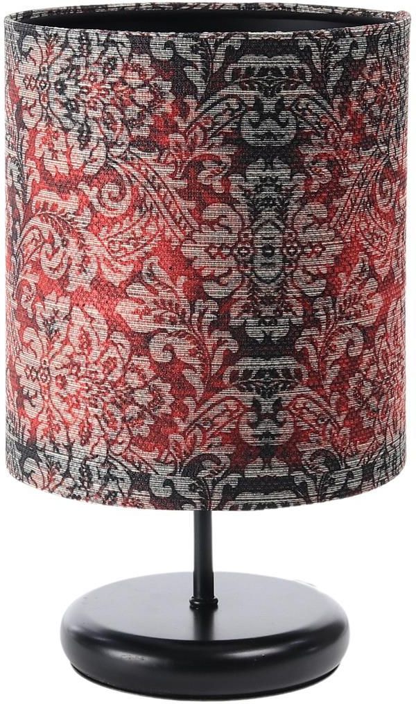 Lampa stołowa RETRO-C w czarno-czerwonym kolorze ze wzorem retro ma abażur wykonany z tkaniny strukturalnej, a podstawa lampy zrobiona jest z metalu o czarnej barwie.