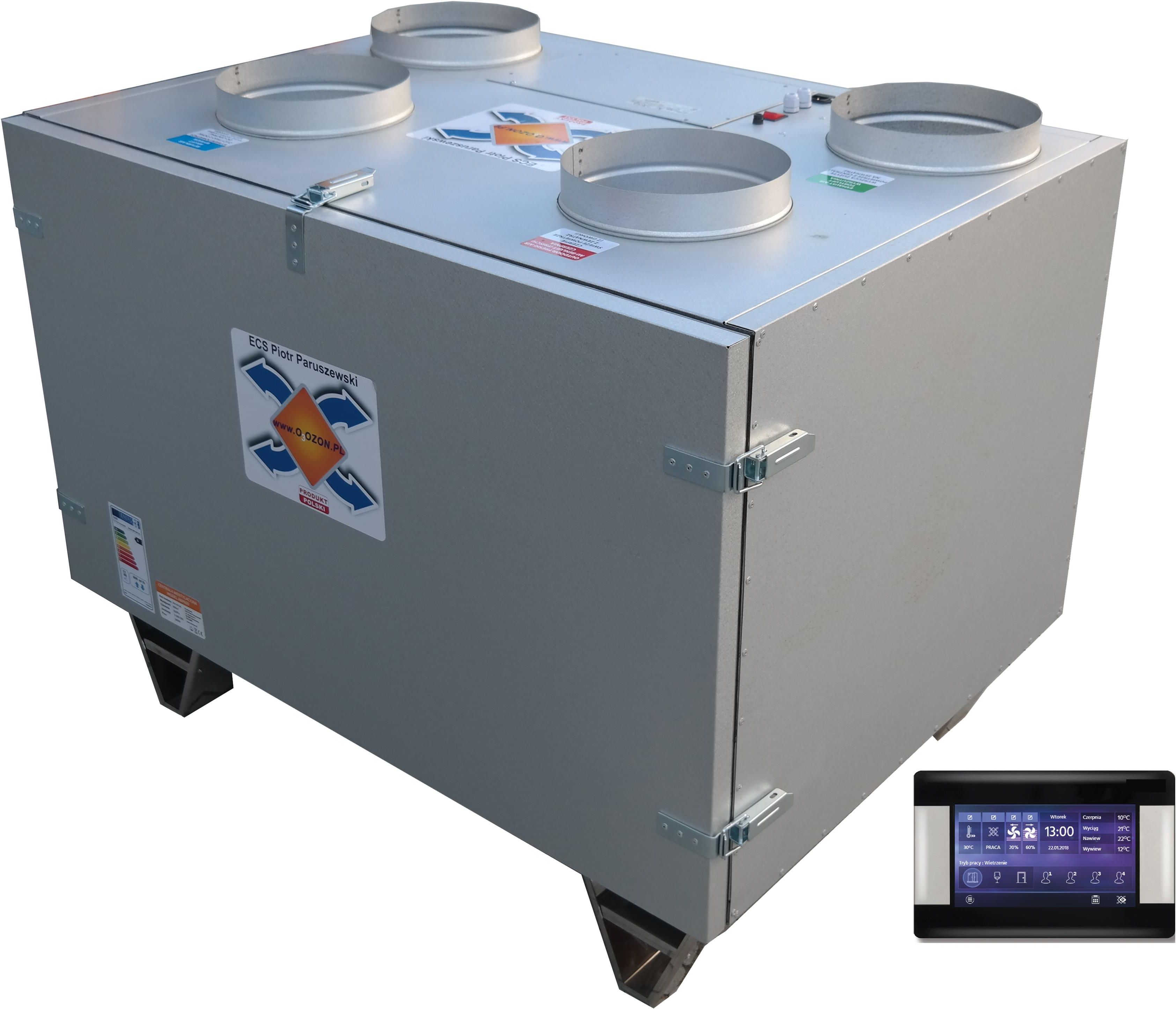 Centrala wentylacyjna rekuperator+ sterownik ABP- 900/250 górna jon16 Centrala ABP-900 spełnia wymagania WFOŚiGW dotyczące programu Czyste Powietrze. Wbudowany jonizator jonów ujemnych Jon ujemny pomaga: Zabijać bakterie, wirusy i grzyby Ułatwia oddychanie Oczyszczać i odświeżać powietrze Przyśpieszać odpoczynek Wzmaga koncentrację Pomaga w nauce Polepsza kondycję Zawiera WENTYLATOR "EC" NIEMIECKIEJ FIRMY WBUDOWANY JONIZATOR ŚREDNICA KRÓĆCA 250 mm OBROTY MAX 2400 obr/min FILTRY KLASY G4 REKUPERATOR PRZECIWPRĄDOWY WYCIĄGANY ŁATWY DO UMYCIA SPRAWNOŚĆ REKUPERATORA OD 65% do 92% (parametr zależy od różnicy temp.przepływu ) MOC URZĄDZENIA OD 80 DO 400W WBUDOWANY SYSTEM OCZYSZCZACZ POWIETRZA (MIKRO CZĄSTEK) SYSTEM ANTYELEKTROSTATYCZNY SYSTEM INFORMACJI O ZABRUDZONYM FILTRZE BY-PASS 100% nawet renomowana konkurencja ma z tym problem !!! OBUDOWĘ WYKONANĄ Z BLACHY 0,7 mm ALUM-CYNK GRUBOŚĆ IZOLACJI 30 mm=3cm IZOLACJA AKUSTYCZNA IZOLACJA CIEPLNA KOMINKOWA ODPORNA NA WYSOKIE TEMP. Z PŁASZCZEM ALUMINIOWYM ODPŁYW SKROPLONEJ WODY !!! BARDZO DOBRY STOSUNEK CENY DO JAKOŚCI PANEL DOTYKOWY PRODUKT POLSKI Firma ECS posiada ponad 16 letnie doświadczenie w produkcji urządzeń dla przemysłu, produkuje dla największych firm renomowanych , międzynarodowych. Każdy model centrali wentylacyjnej powstaje w oparciu o przemyślane rozwiązania i sprawdzoną technologię. Filtr- wkład wykonany jako włóknina klasy G4 Nie musisz kupować drogich filtrów !!!. Można łączyć kilka filtrów np G4+F9+H14 ps smog zostanie zniwelowany w 80-90% Zastosowano wentylatory "EC" PRODUKCJI MADE IN GERMANY Zastosowanie większych wentylatorów zwiększa ich żywotność, oraz wygłusza system wentylacji Obudowa Obudowa wykonana jest z cienkich blach alum cynk obustronnie ocynkowanych, które są specjalnie kształtowane na obrabiarkach numerycznych i montowane na stałe przy pomocy nitów ocynkowanych tworząc sztywną samonośną konstrukcję. Materiał alum cynk zapewnia to doskonałą ochronę powierzchni które mają kontakt z powietrzem wentylacyjnym oraz uszczelnia wszystkie elementy obudowy. Pod względem akustycznym i termicznym, obudowa zabezpieczona jest 30 milimetrową warstwą wełny. Zadaniem jonizatora jest naturalne oczyszczenie powietrza z nieczystości, takich jak: , roztocza, bakterie beztlenowe, kurz dym papierosowy, pyłek kwiatowy itp. BY-PASS 100% WYKONANY NA SIŁOWNIKU SZWAJCARSKIEJ FIRMY GWARANTUJĄCEJ NIEZAWODNOŚĆ Filtr Włóknina G4 (wywiew i nawiew) Bardzo tani filtr możliwość wymiany samej włókniny koszt 2-4 zł Możliwość konfiguracji dowolnej filtra od G1 do U15 (filtry stosowane na sali operacyjnej) Możliwość łączenia kilku filtrów jednocześnie Praca przemysłowa Sterowanie Możliwość sterowania w obiektach o Inteligentnych instalacjach Możliwość dopasowania optymalnych parametrów pracy wentylatora Specyfikacja WYDAJNOŚĆ MAX 900m3/h MOC min 80W max 400W Ciśnienie do 700Pa WYDAJNOŚĆ WENTYLATORÓW "EC" 4x900m3/h "na nawiew 2x900m3/h na wywiew 2x900m3/h" NAPIĘCIE 230 V 50 Hz Sprawność odzysku ciepła od 75% do 92% Obroty silnika 2400 obr/min Poziom hałasu db/(A)3m 24-40 Maksymalna temp pracy do 45C Materiał obudowy blacha alumcynk 0,7mm Wełna 30mm Filtr nawiew G4 Filtr wyciąg G4 Średnica króćców 250 mm Sprawność rekuperatora do max 92% Rekuperator PRZECIWPRĄDOWY Rekuperator TWORZYWO System sygnalizacji zabrudzonego filtra Ba-pass System antyzamrożeniowy Waga około 90 kg JAKOŚĆ MUSI WAŻYĆ PORÓWNAJ Z INNYMI PRODUKTAMI TEJ KLASY Wymiary 900x800x1200 mm PANEL DOTYKOWY Sterownik umożliwia: pomiar temperatur regulacje siły nawiewu sterowanie by-pass ustawianie harmonogramu sterowanie nagrzewnicą załączanie sterowania GWC konfiguracja sterowania chłodnicą wtórną załączenie nagrzewnicy wstępnej sygnalizacja zabrudzonego filtra integracja z systemem BMS, dzięki protokołowi komunikacyjnemu Modbus RTU. możliwość monitoringu jakości powietrza - temperatura, wilgotność, stężenie gazów. do wyboru j. polski, angielski rosyjski aktualizacja oprogramowania poprzez kartę SD. Kompleksowa regulacja stopnia wykorzystania odzysku ciepła itd...... Sercem sterownika jest mikroprocesor o dużej mocy obliczeniowej, w którym zastosowane jest innowacyjne oprogramowanie. System sterowania jest również kompatybilny z aplikacją umożliwiającą zdalne sterowanie urządzeniem przy pomocy komputera lub urządzenia przenośnego. Sterownik zamontowany w centrali posiada funkcje: • odzysku ciepła z wentylowanych pomieszczeń poprzez sterowanie rekuperatorem mechanicznej wentylacji z wymiennikiem przeciwprądowym, krzyżowym lub obrotowym • płynnie sterują pracą wentylatorów nawiewu i wywiewu zapewniając wysoką sprawność odzysku ciepła oraz wymianę powietrza w pomieszczeniach w oparciu o zaprogramowane harmonogramy lub w sterowaniu ręcznym • sterują nagrzewnicami (elektryczną lub wodną) oraz chłodnicą (freonową lub wodną) w sposób płynny, zapewniając wysoki komfort oraz precyzję regulacji wentylowanego powietrza • sterują bypassem oraz gruntowym wymiennikiem ciepła • potrójnej ochrony wymiennika przez zamarznięciem • współpracują z modułem internetowym ecoNET300 i aplikacją mobilną ecoNET.apk i ecoNET.app • współpracują z dodatkowymi panelami pokojowymi • sygnalizacją konieczności wymiany filtrów • sygnalizują oraz zapisują stany alarmowe zapewniając odpowiednią reakcję systemu • zapisują łączny czas pracy poszczególnych komponentów w licznikach oraz liczy sprawność pracy rekuperatora • umożliwiają komunikację poprzez protokół Modbus RTU, którym można sterować lub monitorować działanie całego urządzenia z zewnętrznego systemu zarządzania budynkiem • swobodna konfiguracja przeznaczenia wejść/wyjść rekuperatora umożliwia dostosowanie działania sterownika w zależności od zapotrzebowania Dodatkowy moduł internetowy umożliwia Mod