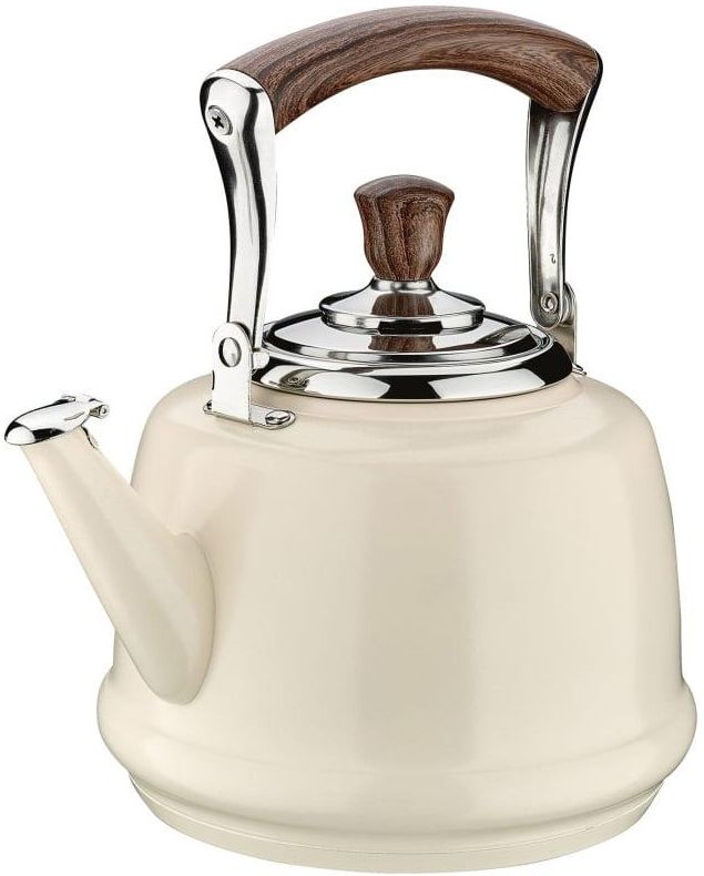 Cilio czajnik stalowy pojemność wody kremowy Bianco Czajnik z klapką, która podskakuje podczas gotowania wody. * czajnik o tradycyjnym wyglądzie z korpusem wykonanym z lakierowanej stali nierdzewnej * nienagrzewający się uchwyt ozdobiony drewnianym wzorem * klapka w pokrywce informujący o gotującej …