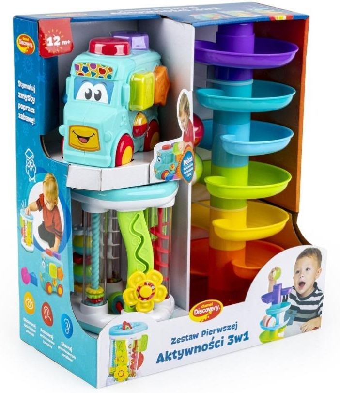 Zestaw Pierwszej Aktywności 3w1 Dumel ✅ ✔️ Potrójnie dobra zabawa w kształty, piłeczki i obrotowe elementy! Zestaw składa się z sortera na kółkach, rolusia z ruchomymi, sensorycznymi niespodziankami i z dużej, wysokiej na 40 cm kolorowej zjeżdżalni z piłeczkami. Wesoły autobusik na ścianach i dachu …