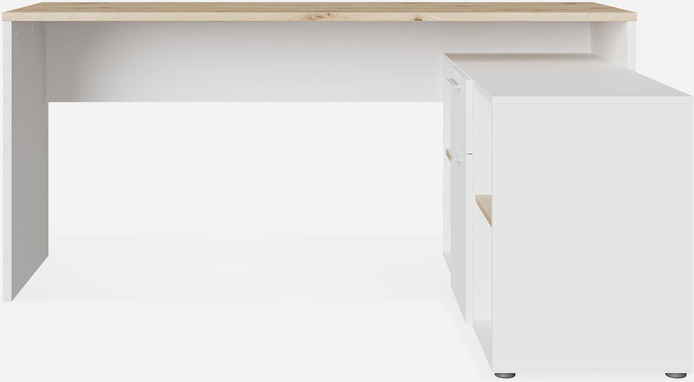 Maksymalnie wykorzystaj przestrzeń z biurkiem narożnym CONTRA COSTA i stwórz odpowiednie miejsce do pracy i nauki. Na blacie o szerokości 160 cm pomieścisz laptop oraz niezbędne akcesoria — oświetlenie, notatniki i artykuły biurowe. Resztę odłożysz na niższy blat komody. W niewielkiej przestrzeni między blatami zmieścisz torbę na laptop czy książki. Półki, szuflada i szafka pomogą utrzymać porządek i ułatwią znalezienie potrzebnych przedmiotów.