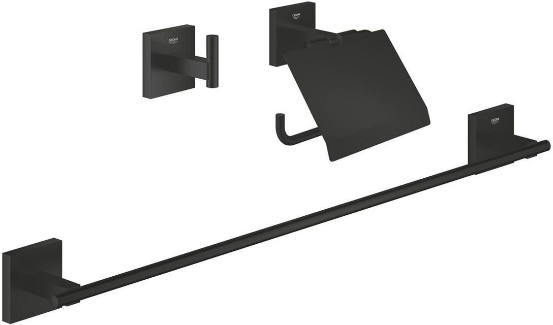 Grohe Start Cube zestaw akcesoriów łazienkowych 3 w 1 411242430 materiał: metal Zestaw składa się z haczyk na płaszcz kąpielowy (40 961) uchwyt na papier (41 102) wieszak na ręcznik kąpielowy 558 mm (41 089) ukryte mocowanie GROHE Long-Life trwała powłoka montaż na śruby i kołki (w zestawie) lub na klej (2 x GROHE QuickGlue A2 41 128 000 sprzedawany oddzielnie) zapasowa płytka montażowa (40 917 000) Kolor: czarny mat Kod producenta: 411242430 Kod EAN: 4067393016427 Start Cube haczyk na płaszcz kąpielowy 409612430 materiał: metal ukryte mocowanie GROHE Long-Life trwała powłoka możwliość przykręcania (przy użyciu śrub i kołków) lub klejenia (GROHE QuickGlue A1 41 127 000 sprzedawany osobno) zapasowa płytka montażowa (40 917 000) Start Cube uchwyt na papier 411022430 materiał: metal z pokrywą ukryte mocowanie GROHE Long-Life trwała powłoka możwliość przykręcania (przy użyciu śrub i kołków) lub klejenia (GROHE QuickGlue A1 41 127 000 sprzedawany osobno) dopuszczalne maksymalne obciążenie: 5 kg - podana wartość ważna jest tylko dla statycznego (wolno przyłożonego) obciążenia oraz w przypadku użytkowania zgodnego z przeznaczeniem zapasowa płytka montażowa (40 917 000) Start Cube wieszak na ręcznik kąpielowy 410892430 materiał: metal 600 mm (rozstaw otworów 558 mm) ukryte mocowanie GROHE Long-Life trwała powłoka możwliość przykręcania (przy użyciu śrub i kołków) lub klejenia (GROHE QuickGlue A2 41 128 000 sprzedawany osobno) maksymalne obciążenie 10 kg - podana wartość ważna jest tylko dla statycznego (wolno przyłożonego) obciążenia oraz w przypadku użytkowania zgodnego z przeznaczeniem zapasowa płytka montażowa (40 917 000)