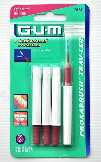 Opatentowana szczoteczka pokryta chlorheksydyną zapewnia antybakteryjną ochronę aż do 2 tygodni. Główka kompaktowej i wygodnej szczoteczki kieszonkowej GUM Trav-Ler zgina się do 90 stopni by zapewnić łatwy dostęp do przestrzeni międzyzębowych. Wentylowane zamknięcie chroni szczoteczkę i może być używane jako rączka. W opakowaniu 1szt. ROZMIARY: 1312 0,6mm Jasny Fiolet (walec) 1314 0,8mm Czerwony (stożek) 1412 0,9mm Pomarańcz (walec) 1414 1,1mm Zielona (stożek) 1512 1,2mm Fiolet (walec) 1514 1,3mm Żółty (stożek) 1612 1,4mm Bordo (stożek) 1614 1,6mm Niebieski (stożek) 1618 2,0mm Szary (walec)