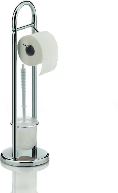 Wolnostojący zestaw na szczotkę do WC oraz papier toaletowy marki Kela, wykonany z metalu chromowanego. Dzięki stojakowi z kolekcji Fabio szczotka oraz papier są zawsze pod ręką, prezentując się elegancko i stylowo. Zestaw ma wysokość 65 cm, a średnica podstawy to 19 cm. Pod spodem zamontowano …
