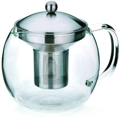 Dzbanek do herbaty, z zaparzaczem * szkło jest odporne na wysokie temperatury, można więc bez obaw wlewać do niego wrzątek * zaparzacz można dowolnie wyjmować w celu wypełnienia ziołami lub wyczyszczenia Wymiary * wysokość 15 cm * średnica 14 cm * pojemność 1,2 l Materiał * szkło * stal nierdzewna