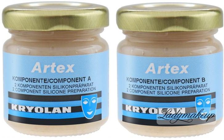 ARTEX marki KRYOLAN (wiodącej na całym świecie profesjonalnej marki oferującej wysokiej jakości kosmetyki charakteryzatorskie, kolorowe i pielęgnacyjne). Preparat dwuskładnikowy to tworzenia imitacji skóry. Idealnie sprawdza się podczas tworzenia ran i blizn, poparzeń. Sprawdzi się podczas maskowania defektów skóry. Odpowiednio nałożony umożliwia osiągnięcie efektu 3D. Po aplikacji staje się elastyczny i nie przeszkadza w noszeniu (również w newralgicznych miejscach). Posiada bezbarwną konsystencję, którą łatwo pokryć kosmetyczną farbą do malowania twarzy. Aby uzyskać produkt końcowy należy połączyć (w równych częściach 1:1) obydwa składniki (A i B). Uzyskaną mieszankę aplikuje się bezpośrednio na skórę. Proces utwardzania rozpoczyna się po 5-6 minutach. Kiedy substancja wyschnie można przystąpić do malowania. W celu usunięcia sztucznej skóry, wystarczy delikatnie pociągnąć. Zestaw należy przechowywać w suchym i chłodnym miejscu w oryginalnym słoiczku.