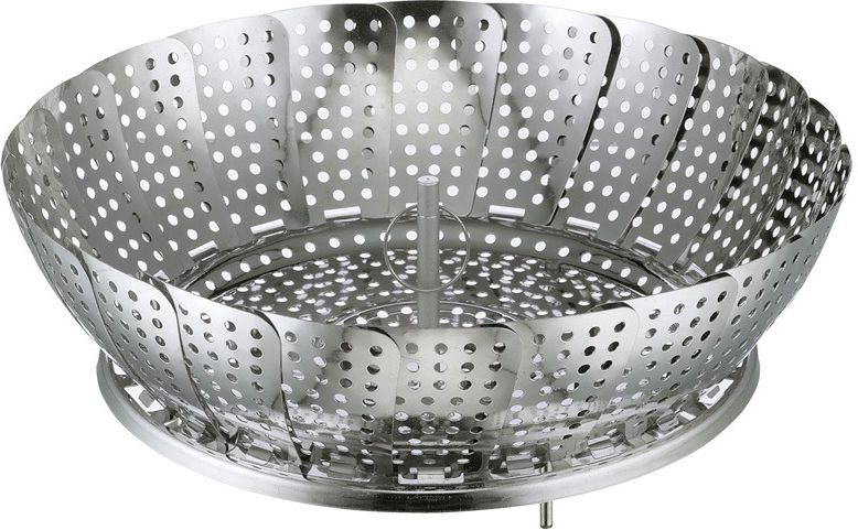 Wkładka Kuchenprofi do gotowania na parze, śred. 24 cm Wkładka do gotowania na parze stalowa wkładka składa się wachlarzowo, dzięki czemu zajmuje mniej miejsca w kuchni przystosowana do garnków o średnicy 24 cm wyposażona w poręczny uchwyt z kółkiem, dzięki któremu łatwiej można ją wyjąć znad …