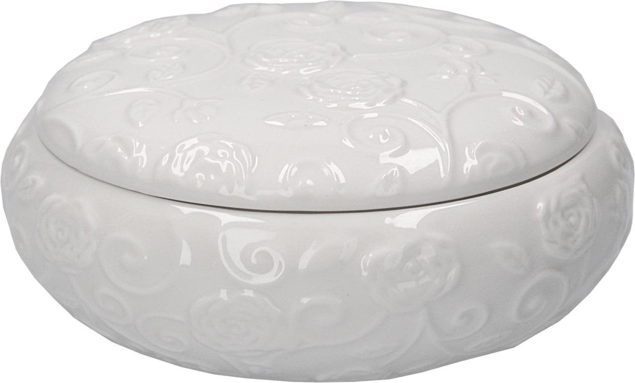 Uroczy pojemnik z pokrywką Florentina o zdobionym rzeźbionym, roślinnym wzorze, który idealnie wpisuje się w styl shabby chic.