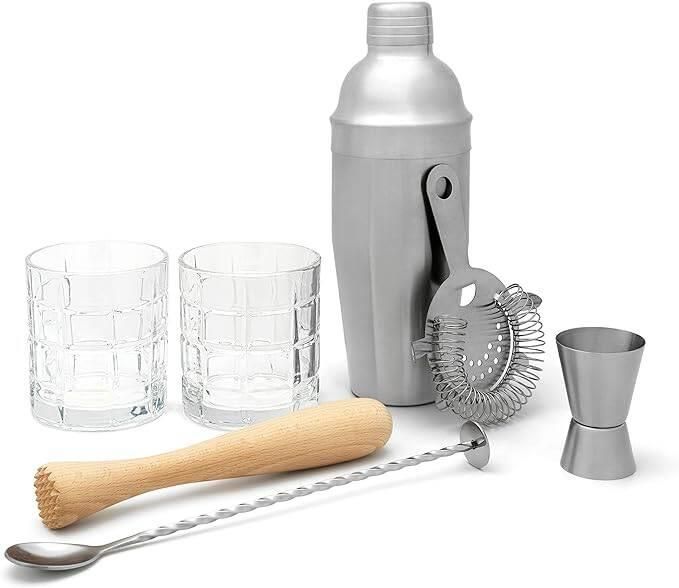 Siedmioczęsciowy zestaw barowy, austriackiej marki Leopold Vienna. W skład zestawu wchodzi: shaker miarka barowa łyżka barowa sitko barowe sczypce do lodu Mudler 2 szklanki do drinkow Materiał: Stal nierdzewna : Szkło :drewno