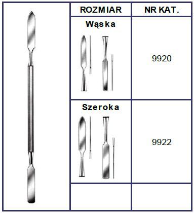 Łopatka do Cementu Dostępne rozmiary: wąska, szeroka. Wyrób Medyczny klasy I. Dostarczone nowe narzędzia nie są jałowe. Przed pierwszym użyciem muszą być umyte i wysterylizowane. Certyfikaty: ISO 9001:2008; ISO 13485:2003, CE zgodnie z dyrektywą 93/42/EEC Czyszczenie i sterylizacja: Natychmiast po użyciu narzędzia namoczyć i opłukać w ciepłej wodzie aby usunąć krew, wydzieliny i osady. Dokładnie oczyścić narzędzia w roztworze czyszczącym przy pomocy miękkiej szczotki. Stosować się do zaleceń producenta środka czyszczącego. Nie stosować szczotek drucianych. Narzędzia złożone należy przed myciem rozmontować. Delikatne narzędzia można myć w myjkach ultradźwiękowych. Opłukać narzędzia w wodzie destylowanej a następnie wysuszyć. Sprawdzić czy narzędzia nie mają śladów uszkodzeń mechanicznych, rys, śladów korozji. Nasmarować ruchome części narzędzia, zawiasy, zamki smarem przeznaczonym do narzędzi chirurgicznych. Przed użyciem sterylizować narzędzie w autoklawie w temperaturze min. 121 °C przez min. 15 minut zgodnie ze szpitalną procedurą. Narzędzia ułożyć w pozycji umożliwiającej sterylizację wszystkich powierzchni.