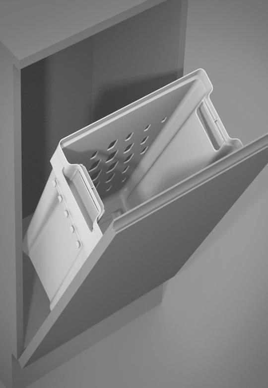 LAUNDRY BOY/ 500/ 40 L Kosz na brudną bieliznę Laundry Boy przystosowany do montażu w płytkich szafkach uchylnych. Nadaje się do szafek o szerokości od 500 mm i więcej, jest to świetne rozwiązanie do zastosowania w łazienkach czy pralniach. Kosz uchylny jest dostarczany w komplecie z uchwytami montażowymi. Kosz uchylny posiada jeden ażurowy pojemnik w kolorze białym o pojemności 40 litrów, który pomieści wystarczającą ilość prania do co najmniej jednego pełnego wsadu, a duże zintegrowane uchwyty w bokach kosza ułatwiają wyciąganie kosza z szafki i przenoszenie go z ładunkiem w pobliże pralki. Wymiary pojemnika: szer. 420 mm x gł. 220 mm x wys. 505 mm. Aby zamontować kosz w szafce wymagana jest odpowiednia przestrzeń montażowa. Kosz Laundry Boy potrzebuje tylko 222 mm na głębokość, na szerokości 440 mm i na wysokość około 560 mm (wszystkie wymiary dotyczą wymiarów światła szafki). Mocujemy go na froncie szafki z pomocą specjalnych uchwytów montażowych i w nie wpinamy pojemnik. Front powinien być przymocowany z użyciem 2 zawiasów nakładanych na dole szafki oraz ogranicznika otwarcia zabezpieczającego front przed zbyt szerokim otwarciem (zawiasów, rozwórki nie ma w zestawie). Kompletny zestaw systemu wraz z szafką pokazany na zdjęciach jest tylko naszą propozycją aranżacji i jako całkowity komplet nie stanowi oferty sprzedażowej. Parametry: - Głębokość światła szafki: min.222 mm - Wysokość światła szafki: min.560 mm - Szerokość światła szafki: min.440 mm - Kolor: biały