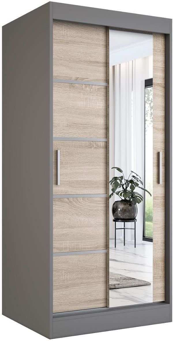 Szafa przesuwna MODUO COMFORT 2 90 antracyt/dąb sonoma posiada jeden front z dekoracyjnymi listwami, a drugi z dużym lustrem.