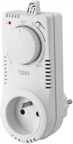 Termostat gniazdkowy Zalety termo wyłącznika gniazdkowego TS01: prosta obsługa funkcja nocnego obniżenia (jeden przycisk dotykowy zmniejsza ustawioną temperaturę o 3 °C w ciągu 8 godzin) regulowania temperatury po 1 °C ochrona przed zamarzaniem (3 °C) Regulacja temperatury termostatu gniazdkowego TS01: Szybkie ustawienie żądanej temperatury za pomocą pokrętła. Nastawioną temperaturę zachowuje pamięć E-EPROM przy awarii zasilania lub wyjęcia z gniazda. Dane Techniczne: Zasilanie: 230,0 V / 50 Hz Histereza: stała (0,3°C) Zakres regulacji temperatury: 3 °C do 28 °C Ustawienie temperatury: 1,0 °C Błąd pomiaru: 1°C Element przełączający: przekaźnik Wyjście: 16 A Bateria zapasowa: Nie Stopień ochrony: IP20 Temperatura pracy: 0 °C do 40 °C Gwarancja: 24 miesiące