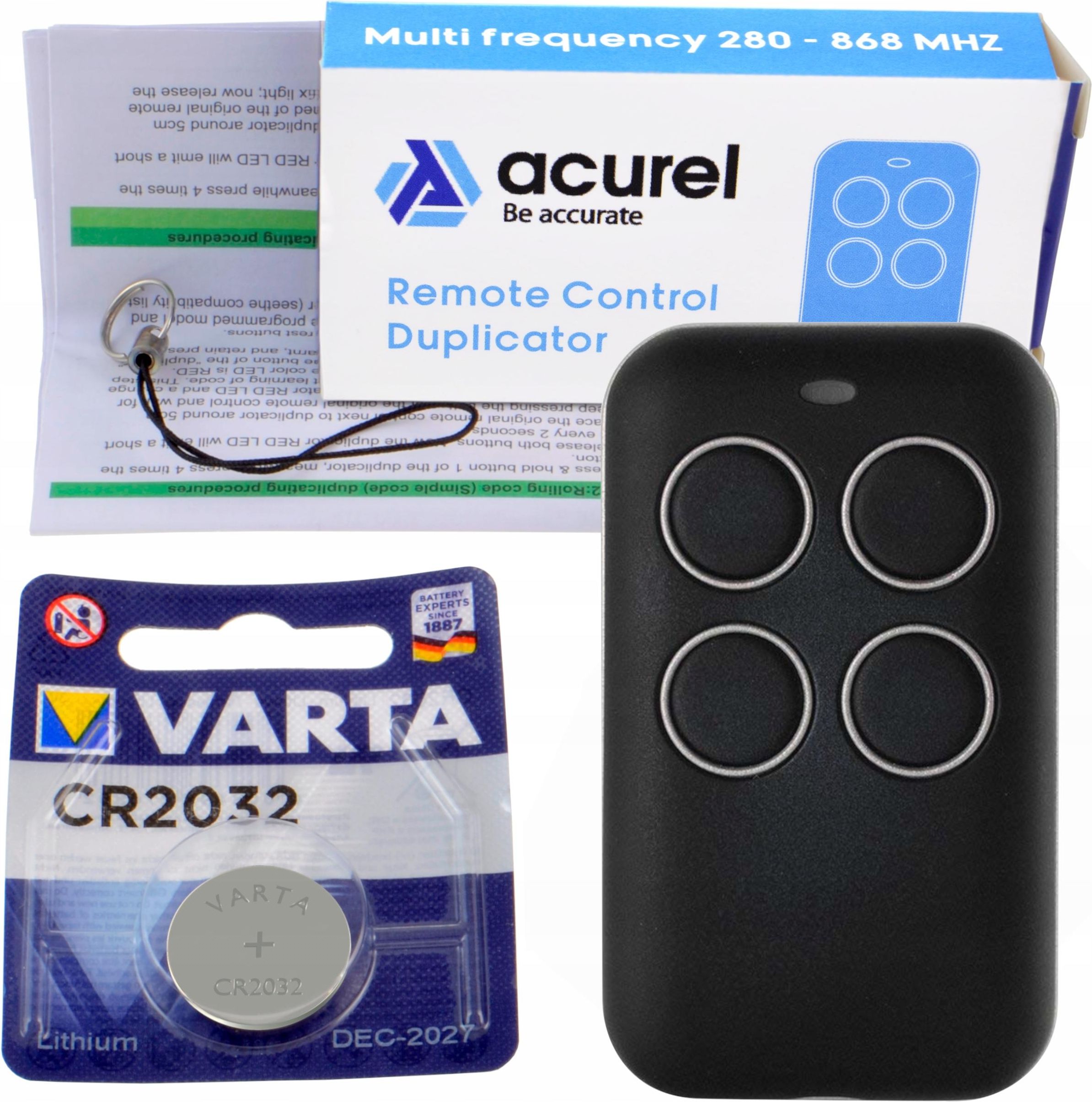 Pilot Samokopiujący Uniwersalny do Bramy Rolet 280-868mHz - KR37 Acurel Oryginalny Pilot marki ACUREL Pilot kopiuje 99% typów pilotów dostępnych na rynku. Pilot 4 kanałowy pracujący w częstotliwości 280-868MHz. Pilot jest samokopiujący i idealnie nadaje się do skopiowania istniejącego pilota. Uniwersalny pilot samokopiujący umożliwia kopiowanie pilotów z kodem stałym, zmiennym oraz dynamicznym. Obsługuje także szeroki zakres częstotliwości, dzięki czemu jest najbardziej uniwersalnym pilotem dostępnym na rynku, zdolnym do skopiowania 300 różnych modeli pilotów, czyli aż 99% typów pilotów dostępnych na rynku. W zestawie znajduje się także zawieszka, dzięki której można przypiąć pilot np. do kluczy. Pilot posiada cztery kanały, które umożliwiają skopiowanie pięciu kodów (możliwe jest skonfigurowanie dwóch przycisków jednocześnie, które będą działać jako jeden oddzielny, piąty kanał) Możliwość kopiowania wielu urządzeń na jeden pilot Nie musisz zastanawiać się czy pilot, który kupisz obsłuży Twoje urządzenie. Masz dwa, trzy różne piloty pracujące w różniej częstotliwości, z różnymi kodami? Teraz możesz obsłużyć je wszystkie jednym pilotem, konfigurując przyciski odpowiednio dla każdego pilota. Pilot obsługuje kod zmienny Oznacza to, że sterowniki bram z kodem zarówno stałym, jak też zmiennym, będą obsługiwane przez pilot. Szeroki zakres częstotliwości 280-868MHz Praca w wielu częstotliwościach opiera się na automatycznym skanowaniu oryginalnego pilota i dopasowaniu do jego częstotliwości. Główne cechy i funkcje pilota Kopiowanie pilotów z kodem stałym, zmiennym oraz dynamicznym Wysoka kompatybilność z pilotami innych producentów - kopiowanie ponad 300 różnych marek pilotów Duży zakres częstotliwości pracy: 280-868MHz Automatyczne skanowanie oryginalnego pilota i dostosowywanie do wykrytej częstotliwości Cztery kanały, do skopiowania pięciu kodów (możliwe jest skonfigurowanie dwóch przycisków jednocześnie, które będą działać jako jeden oddzielny, piąty kanał) Możliwość zaprogramowanie każdego przycisku pod inny pilot Duży zasięg pracy - 100-150m, w zależności od przeszkód Solidne wykonanie i estetyczny wygląd Obudowa wykonana z materiału odpornego na zachlapanie wodą Zastosowanie pilota Piloty samokopiujące są idealnym rozwiązaniem dla osób, które np. posiadają jeden działający pilot i chcą dorobić do niego kolejne zapasowe duplikaty lub przekazać kopie innym osobom. Pilot kopiuje sygnały w takich urządzeniach jak: Drzwi garażowe Bramy Ogrodzenia Produkty Smart Home (np. włączniki) Zabezpieczenie domu Produkty przemysłowe Produkty użytku domowego Jeden pilot - wiele możliwości Pilot nadaje się do kopiowania sygnału nie tylko w bramach wjazdowych, ale także innych urządzeniach domowych, takich jak np. automatyczne rolety czy zdalne włączniki oświetlenia. W linku poniżej znajduje się filmik z prezentacji zestawu oraz obsługi pilota samokopiującego https://youtu.be/IcVuHd_YJz4 Pilot jest na tyle uniwersalny, że jest kompatybilny z ponad 300 pilotami, wśród których można wymienić ADYX PRIMATIC BALLAN BENINCA BFT CARDIN DITEC FAAC FADINI GENIUS GIBIDI MOOVO MHOUSE NEO Nice-Flo Nice Smilo 0&O PRASTEL PUJOL SEAV SOMFY SOMMER TAU TELCOMA. Lista producentów bram oraz rodzaje pilotów, z którymi współpracuje Pilot KR37 ACM: TX2, TX2 COLOR, TX4 ADYX: TE4433H BLUE, 433-HG BRAVO AERF: COMPACT, HY-DOM, MERCURI B, MERCURI C, SABUTON, MARS, SATURN, ST3/N, TERRA, TMP-1, TMP-2, UNITECH ALLMATIC: BROWN, BROWN RED, BRO.OVER, PASS, MINIPASS, TECH3 APERIO: GO, GO PRO, GO MINI APERTO (Sommer): 4020-TX03-434, TX02-434-2, TX02-868-2 APRIMATIC: TR, TM4, TXM ATA: PTX4 BLU, PTX4 PINK AVIDSEN: 104251, 104250, 104250 OLD, 104250 RED, 104257, 104350, 654250 BALLAN: FM400, FM400E BENINCA: TO.GO.WV, TWV, ROLLKEY, APPLE, LOT WCV, CUPIDO, TO.GO.QV, BENINCA: IO BFT: MITTO, MITTO M, MITTO RCB, MITTO A, TRC, GHIBLI, MURALE, KLEIO CARDIN: TRQ S449, XRADO TRQ S449 GREEN (PRECODE),TXQ S449, TXQ S449 GREEN, TRQ S486, TXQ S486, S437 TX, CASALI: JA33 AMIGO, GENIUS/CASALI A252RC CAME: T432, T434, TOP432, TOP432A, TOP434A, TOP432, TOP432NA, TOP434NA, TOP432M, TOP434M, TAM432SA, TOP432SA, TOP432NA, TWIN2, TWIN4, TOP432S CHAMBERLAIN / LIFT MASTER MOTOR LIFT: 953ESTD, 371 LM, 971LM, 84330E, 94334CE,94333E/94334E/94335E, 9747E,1A5639-7, 1A5477, 1A6487, 132B2372,94330EML/9333EML/ 94335EML,84330EML/84333EML/84335EML,8747EML CLEMSA: MUTANCODE, T, T-8, E-CODE N, MASTERCODE MV DASPI: ZERO RC DEA SYSTEM: PUNTO 278, GOLDR, GENIE R 273, GENIE R-GT2N, MIO TR, GT2M, TRN DITEC: BIXLP, GOL4, BIXLG DOORHAN: TRANSMITTER 4 DOORMATIC: MILENY, MILENY-EVO ECOSTAR: RSC, RSE, RSZERREKAIRIS, ROLLER 2, ROLLER 433, ROLLER 868, SOL433, SOL868, VEGA 433, VEGA 868 ERREKA: IRIS, ROLLER 2, ROLLER 433, ROLLER 868, SOL433, SOL868, VEGA 433, VEGA 868 FAAC: TML 433SLH, DL 868 SLH,XT 868 SLH, XT 433 SLH, T 868 SLH, T 433 SLH, XT 868 SLH BLACK, XT 433 SLH BLACK,XT 433 RC, TE433HG, XT4 433 RCBE FADINI: JUBI-SMALL, JUBI 433 GENIE: GITR-3, GIT, GICT390, GIFT390-1, G3T-BX, G1T-BX, GM3T, GICTD, GIFTD GENIUS: AMIGOLD, AMIGO, KILO, BRAVO, ECHO GIBIDI / JCM: Au1600, AU1600 WOOD, AU1680, AU1680 WOOD, DOMINO JCM: GO, GO PORTIS, GO NORTON, NEO, TWIN KBLUE: ETH-TEL01 KEY: 900TXB-42R, TXB 44R, SUB 44R KING GATES: CLIPPER, STYLO KLING: KUA, KUA E, KUA S LABEL: SPYCO LIFE: FIDO LINEAR: MCT-11, ACT-21, ACT-22, STING RAY ACT-31, STING RAY ACT- MERLIN 2.0E945M, E943M, E940M MERLIN / PROLIFT: C945, C940, C943, M842, M844 MHOUSE: TX3, TX4, GTX4 MOOVO: MT4G NICE: SMILO, FLOR-S, VERY-VR, FLOR-S ERA NICE: ONE (ON), ON ERA, INTI, ERGO, PLANO, ONE (ON FM) NORTON: NEO, TXCD, GO NORTON, GO MINI NORTON NOVOFERM: MCHS, MICRO-NOVOTRON 502, MINI-NOVOTRON 504, MICRO-NOVOTRON 502,MICRO-NOVOTRON 504, MICRO-NOVOTRON 31, MICRO-NOVOTRON 51,MINI-NOVOTRON 30, MINI-NOVOTRON 50, MNHS, O&O: TX, T_COM R4-2, T_COM R8-2, TWIN, TX (NEO) PECCININ: T