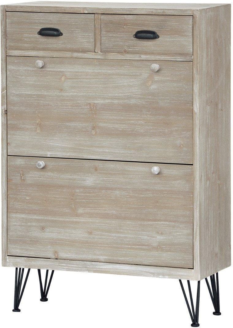 Komoda w stylu retro, na metalowych nóżkach z trzema otwieranymi uchylnie drzwiami z wbudowanymi półkami na buty. Komoda w kolorze jasnego drewna z widoczną strukturą drewna, bielona.