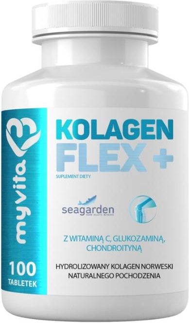 MyVita Kolagen Flex+ – Norweski kolagen na zdrowe stawy i piękną skórę MyVita Kolagen Flex+ to zaawansowany suplement diety w tabletkach, oparty na wysokiej jakości hydrolizowanym kolagenie morskim SeaGarden, pozyskiwanym z dziko żyjącego dorsza atlantyckiego. Zawiera kolagen typu I, kluczowy dla zdrowych stawów, skóry, włosów i paznokci. Dzięki formie hydrolizowanej składnik ten cechuje się doskonałą przyswajalnością i stabilnością. Dlaczego warto wybrać Kolagen Flex+? Wspiera zdrowie stawów i chrząstki – dzięki obecności glukozaminy i chondroityny, które naturalnie występują w tkankach stawowych i wspomagają ich regenerację. Naturalne źródło kolagenu – kolagen SeaGarden pochodzi z ryb żyjących w czystych wodach północnego Atlantyku. Poprawia wygląd skóry, włosów i paznokci – kolagen typu I odpowiada za jędrność, elastyczność i zdrowy wygląd skóry. Zawiera witaminę C – niezbędną do prawidłowej produkcji kolagenu w organizmie, a także do ochrony komórek przed stresem oksydacyjnym. Skład aktywny (2 tabletki) Hydrolizowany kolagen norweski – 800 mg Glukozamina – 200 mg Chondroityna – 100 mg Witamina C – 30 mg (37% RWS) L-Leucyna – 200 mg Dla kogo? Dla osób aktywnych fizycznie Dla seniorów dbających o kondycję stawów Dla kobiet, które chcą poprawić jędrność i wygląd skóry Dla wszystkich, którzy chcą naturalnie uzupełnić kolagen w diecie Dodatkowe informacje Zalecane spożycie Dorośli: 2 tabletki dziennie. Tabletki popić wodą. Składniki: Norweski kolagen hydrolizowany z dorsza atlantyckiego (Gadus morhua), substancje wypełniające: celuloza i fosforan wapnia, siarczan glukozaminy 2KCL, L-Leucyna, siarczan chondroityny, witamina C (kwas L-askorbinowy), substancja wypełniająca: dwutlenek krzemu. 2 tabletki zawierają: kolagen 800 mg, glukozamina 200 mg, chondroityna 100 mg, witamina C 30 mg (37%)*, L-leucyna 200 mg. *RWS — Referencyjna Wartość Spożycia Ostrzeżenia: Stosowanie suplementu diety przez kobiety w ciąży i karmiące piersią oraz dzieci należy omówić z lekarzem. Ważne wskazówki: Nie należy przekraczać zalecanej dziennej porcji. Zrównoważony sposób żywienia i prawidłowy tryb życia jest ważny dla funkcjonowania organizmu człowieka. Suplement diety nie może być stosowany jako substytut (zamiennik) zróżnicowanej diety. Przechowywać w sposób niedostępny dla małych dzieci, w temperaturze pokojowej. Korzystny efekt wynikający z deklarowanego działania występuje w przypadku spożycia 2 tabletek dziennie. Zawartość netto: 100 tabletek Produkt nie zawiera stearynianu magnezu.