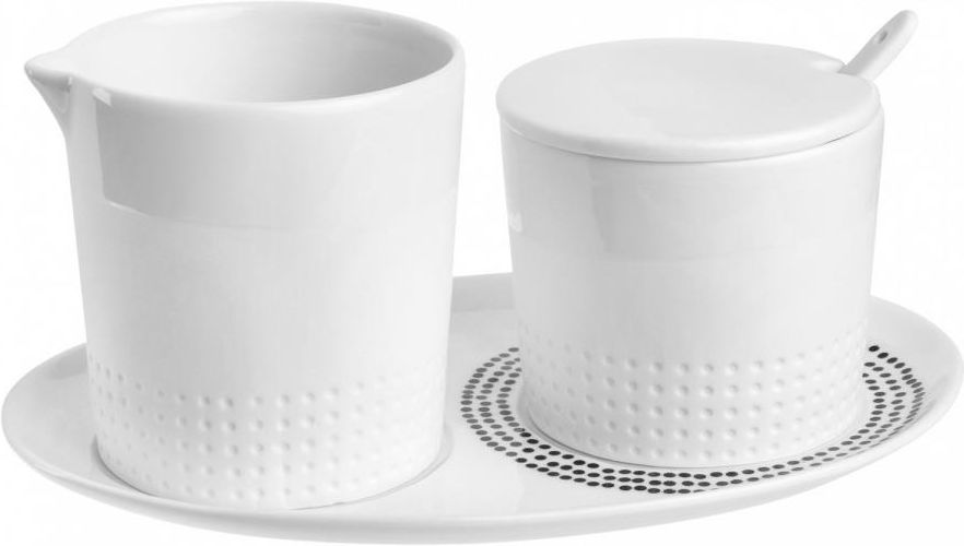 Mlecznik i cukierniczka Any Time Rader Podstawowe informacje Producent: Rader Kod produktu: C14733 Kolor: biały Materiał: porcelana Wymiary: 17 x 11 x 7 cm (całość: szer. x gł. x wys.) Pojemność: 0,15 l • Zestaw do kawy – nie musisz szukać już dodatkowych naczyń. • W komplecie porcelanowa łyżeczka. • Pojemność mlecznika w sam raz na 3 kawy. • Uniwersalna stylistyka – pasują do różnych filiżanek. Chcesz podać kawę, ale nie wiesz do czego wlać mleko? Brakuje Ci łyżeczki pasującej do cukierniczki? Te i inne problemy rozwiązuje zestaw Any Time marki Rader. W całości wykonany jest z porcelany i składa się z mlecznika o pojemności 150 ml oraz cukierniczki. Do kompletu zostały dołożone podstawka i łyżeczka. Całość prezentuje się bardzo nowocześnie – jedynymi zdobieniami są wytłaczane punkty na naczyniach oraz malowane na podstawce. Zestaw Any Time Rader, dzięki uniwersalnej kolorystyce, dobrze komponuje się z różnymi filiżankami. Wszystkie elementy kompletu należy myć ręcznie.