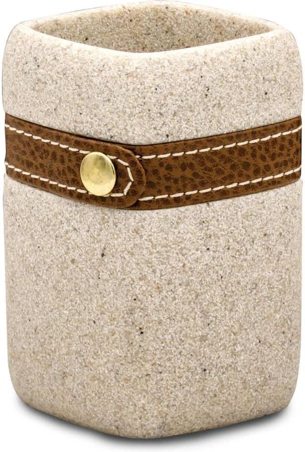 Piękny, stylizowany na kamień kubek na akcesoria łazienkowe Superior marki RIDDER, to akcesorium, które nadaje łazience naturalny, a jednocześnie przytulny wygląd. Stylowy kubek o pojemności 310 ml został wykonany z poliżywicy tworzącej powierzchnię stylizowaną na kamień w rustykalnym charakterze. Załączona opaska, wykonana jest ze skóry syntetycznej i ozdobiona małym, złotym guzikiem. Przechowasz w nim szczoteczki do zębów, przybory do makijażu oraz inne akcesoria. Wprowadza również ciepłą atmosferę do wystroju łazienki. Dodatkowo możesz dopasować ten produkt do innych akcesoriów łazienkowych z kolekcji marki RIDDER, które składają się z praktycznych i modnych produktów do codziennego użytku w kolorach odpornych na promieniowanie UV i charakteryzujących się długą żywotnością.