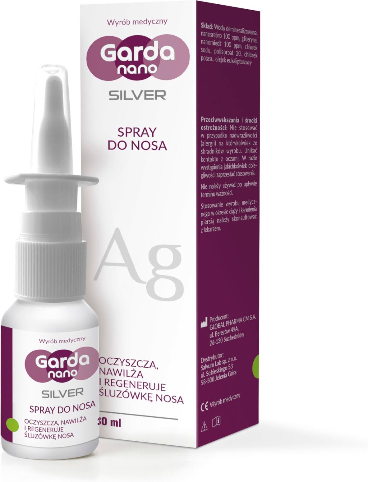 Garda Nano SILVER spray do nosa POJEMNOŚĆ: 30 ml ZASTOSOWANIE Oczyszcza, nawilża, regeneruje błonę śluzową nosa. Wyrób medyczny Garda Nano Silver spray do nosa może być stosowany wspomagająco w: regeneracji błony śluzowej nosa, tworzeniu na powierzchni błony śluzowej nosa filmu ochronnego, który zabezpiecza ją przed szkodliwym działaniem czynników zewnętrznych, stanach nieżytu nosa i zatok . Produkt przeznaczony jest dla osób dorosłych i dzieci powyżej 6. roku życia. SPOSÓB UŻYCIA Przed pierwszym użyciem należy kilkakrotnie nacisnąć dozownik, aby wypełnić go płynem. Należy umieścić aplikator w otworze nosowym i naciskając rozpylić do każdego otworu nosowego. U dzieci powyżej 6 roku życia i dorosłych zaleca się stosować 1 do 3 dawek sprayu do każdego otworu nosowego 2 do 3 razy dziennie. Ze względów higienicznych oraz w celu zapobiegania rozprzestrzeniania się infekcji, jedno opakowanie należy przeznaczyć dla jednej osoby. Po każdym użyciu wyrobu, końcówkę należy umyć pod bieżącą wodą i delikatnie osuszyć. SKŁAD Woda demineralizowana, nanosrebro 100 ppm, gliceryna, nanomiedź 100 ppm, chlorek sodu, polisorbat 20, chlorek potasu, olejek eukaliptusowy