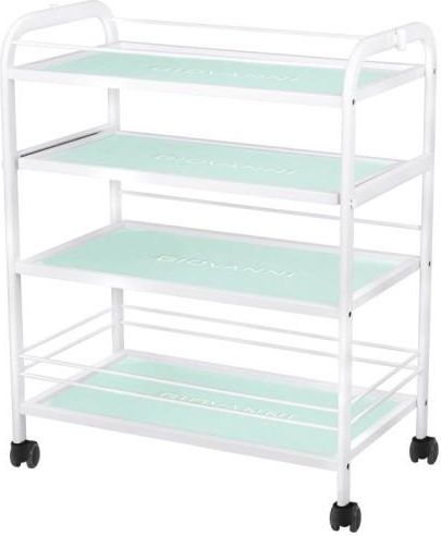 Stolik kosmetyczny 1015 Estetyczny stolik pod urządzenie kosmetyczne, metalowo-szklany, z kółkami. Posiada cztery szklane półki.szklane półki z wygrawerowanym logo GIOVANNI Wymiary:- wymiary stolika 54*40*83 cm - waga stolika 16 kg Dane techniczne:- kolor biały - szklane półki - gumowane kółka 4 szt.- wymiary opakowania 85*51*13 cm- waga brutto 19,3 kg- ilość opakowań 1