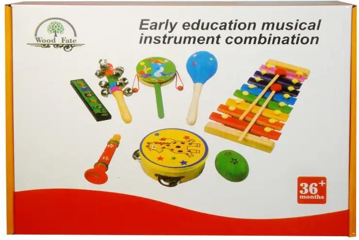 Zestaw instrumentów muzycznych składający się z różnych instrumentów, m.in. tamburyna, cymbałków, marakasów, grzechotek i innych. Zabawka rozwija poczucie rytmu, koordynację ruchową i wrażliwość muzyczną. Instrumenty zapakowane w kartonowe pudełko. Podane wymiary są wymiarami opakowania. Zabawka przeznaczona dla dzieci od 3 lat.