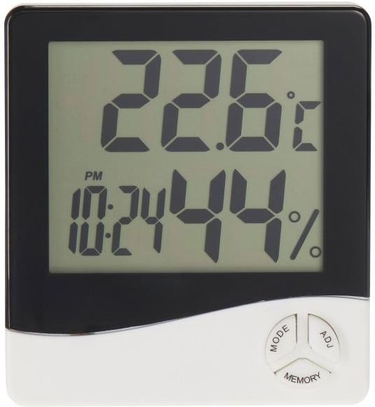 Elektroniczny termometr pokojowy z higrometrem to wygodny przyrząd do codziennego kontrolowania temperatury w pomieszczeniu. Posiada również dodatkowe funkcje zegarka z budzikiem. Produkt wyposażony został w wygodny do odczytywania wyświetlacz LCD. Wykonany z tworzywa sztucznego w kolorze białym pasuje do wnętrz z wyposażeniem o różnej kolorystyce.