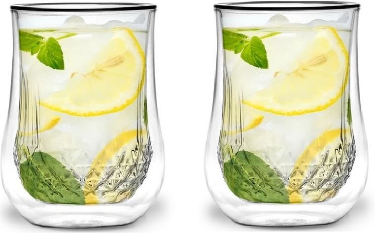 Szklanki z kolekcji Diamante to idealny przykład na to, że zastawa stołowa wcale nie musi być nudna! Zestaw szklanek o niebanalnym wzorze to świetna propozycja dla ludzi z wyobraźnią. Swoim kształtem przypomina rżnięty kryształ. Szklanki są połączeniem klasyki i nowoczesności. Będą fikuśną ozdobą każdego stołu. Szklanki z podwójnymi ściankami, świetnie izolują i utrzymują pożądaną temperaturę napoju. Dzięki temu zimą możemy dłużej cieszyć się ciepłą herbatą, bez obaw przed poparzeniem, a latem zimnym napojem lub deserem, nie ogrzewając go nawet, gdy trzymamy szklankę w ciepłej dłoni. Szklanki wykonane z solidnego szkła boro-krzemowego. Koktajle, desery i świeże soki oprócz oczywistych walorów smakowych, przede wszystkim przyciągają nas wzrokiem. Aby podkreślić staranność ich wykonania, należy zaopatrzyć się w naczynie, które odpowiednio kusząco je wyeksponuje. Są świetne zarówno w domu, jak i profesjonalnej gastronomii. Cechy produktu: zestaw zawiera 2 szklanki, wykonane ze szkła boro-krzemowego, odporne na szok termiczny, posiadają podwójne ścianki, które izolują i utrzymują temperaturę, nadają się do serwowania gorących i zimnych napojów, producent zaleca mycia ręczne, idealne na każdą okazję. Wymiary produktu: wysokość 11 cm, średnica 8,5 cm, pojemność 300 ml.