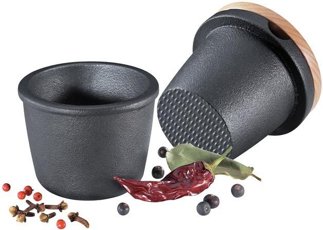 Moździerz wykonany z wytrzymałego żeliwa, zaprojektowany przez Zassenhaus, ze specjalną tarczą trącą i pojemnikiem na starte przyprawy z bukową przykrywką. Moździerz nadaje się zarówno do suszonych, jak i świeżych ziół. Moździerz Zassenhaus pozwala na uzyskanie grubo lub drobno utartych przypraw, w zależności od siły nacisku i skręcania. Urządzenie jest bardzo poręczne i łatwo mieści się w dłoni, a jego masywność sprawia, że zioła ucierają się bardzo szybko. Wnętrze moździerza oraz tarcza trąca są rowkowane, dzięki czemu ziarna pieprzu, kolendry czy sól mielą się błyskawicznie i równomiernie. Zmielone przyprawy, które nie będą użyte od razu, można wygodnie przechowywać we wnętrzu stożka trącego, który posiada szczelną pokrywkę z drewna bukowego. Wymiary moździerza: średnica 8 cm, wysokość 9 cmWaga: 1 kg