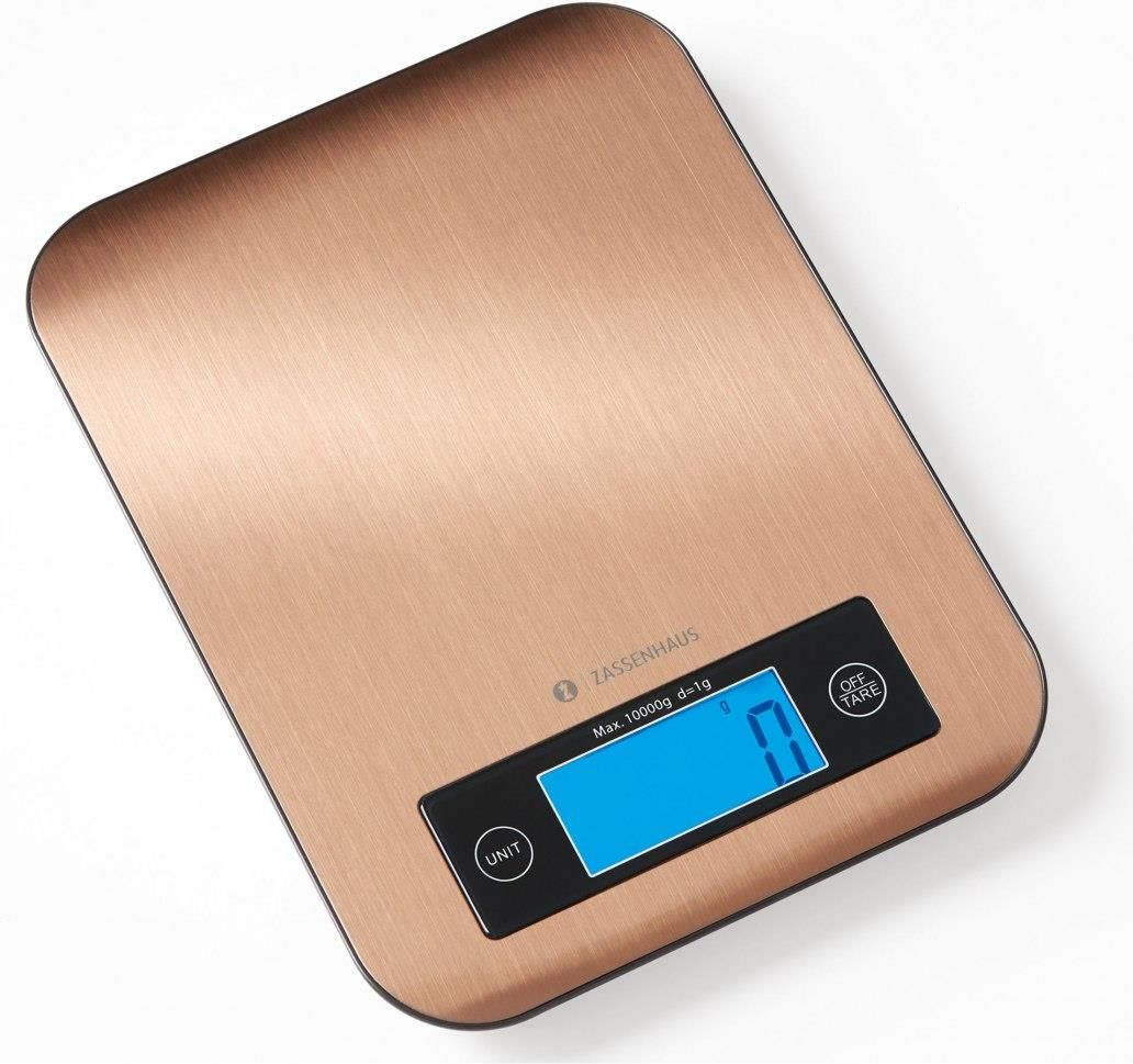 Waga kuchenna elektroniczna ZASSENHAUS Pure Specyfikacja techniczna Id produktu: 156351 Wysokość całkowita: 1,5 cm Długość: 21,5 cm Szerokość całkowita: 16,5 cm Max. obciążenie: 10,0 kg Dokładność: 1 g Zasilanie: 2 x aaa (dołączono) Symbol producenta: zs-073522 Kolor: miedziany Materiał: stal nierdzewna -------------------------------------------- Możliwość stosowania