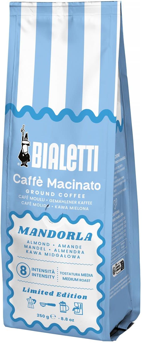 Bialetti Perfetto Moka Mandorla to włoska kawa mielona o ciemnym profilu palenia. Mieszanka składa się w 80% z Arabiki i w 20% z Robusty, a swój smak zawdzięcza dodatkowi aromatu migdałowego. Intensywnie Migdałowa, o gęstej teksturze. Ze względu na grubość mielenia, kawa jest polecana szczególnie do kawiarki. Odpowiedni stopień mielenia pozwala łatwiej zaparzyć kawę w poprawny sposób. Woda przepływa przez zmieloną kawę w odpowiednim tempie, co przekłada się na poprawną ekstrakcję i napar o oczekiwanym smaku. Odmiana: 80% Arabika, 20% Robusta Stopień palenia: Ciemny Profil smakowy: Migdał; łagodna Body: Gęste Składniki: kawa mielona z aromatem migdałowym.