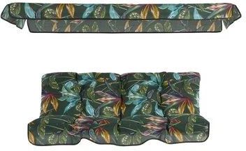 Podkreśl charakter swojego ogrodu lub tarasu dzięki kompletnemu zestawowi poduszek z daszkiem do huśtawki 3-osobowej w wyrazistym, liściastym wzorze na ciemnozielonym tle.