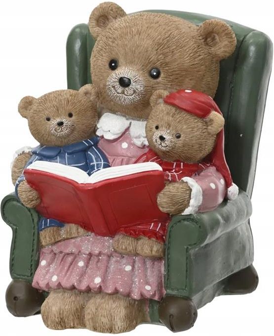 Figurka świąteczna trzy misie na fotelu ozdoba 17cm Urocza figurka wykonana z żywicy, przedstawiająca trzy misie siedzące razem na fotelu. To pełna detali dekoracja, która wniesie do wnętrza ciepło, radość i świąteczną atmosferę. Dzięki solidnemu wykonaniu i eleganckiemu wykończeniu, figurka będzie piękną ozdobą na wiele sezonów. Zalety Uroczy motyw świąteczny – idealny do zimowych aranżacji Trwała i solidna konstrukcja z żywicy Idealna dekoracja na stół, komodę, parapet lub pod choinkę Świetny pomysł na prezent dla bliskich Parametry Szerokość: 14 cm Wysokość: 17 cm Głębokość: 13 cm Materiał: żywica Motyw: trzy misie na fotelu
