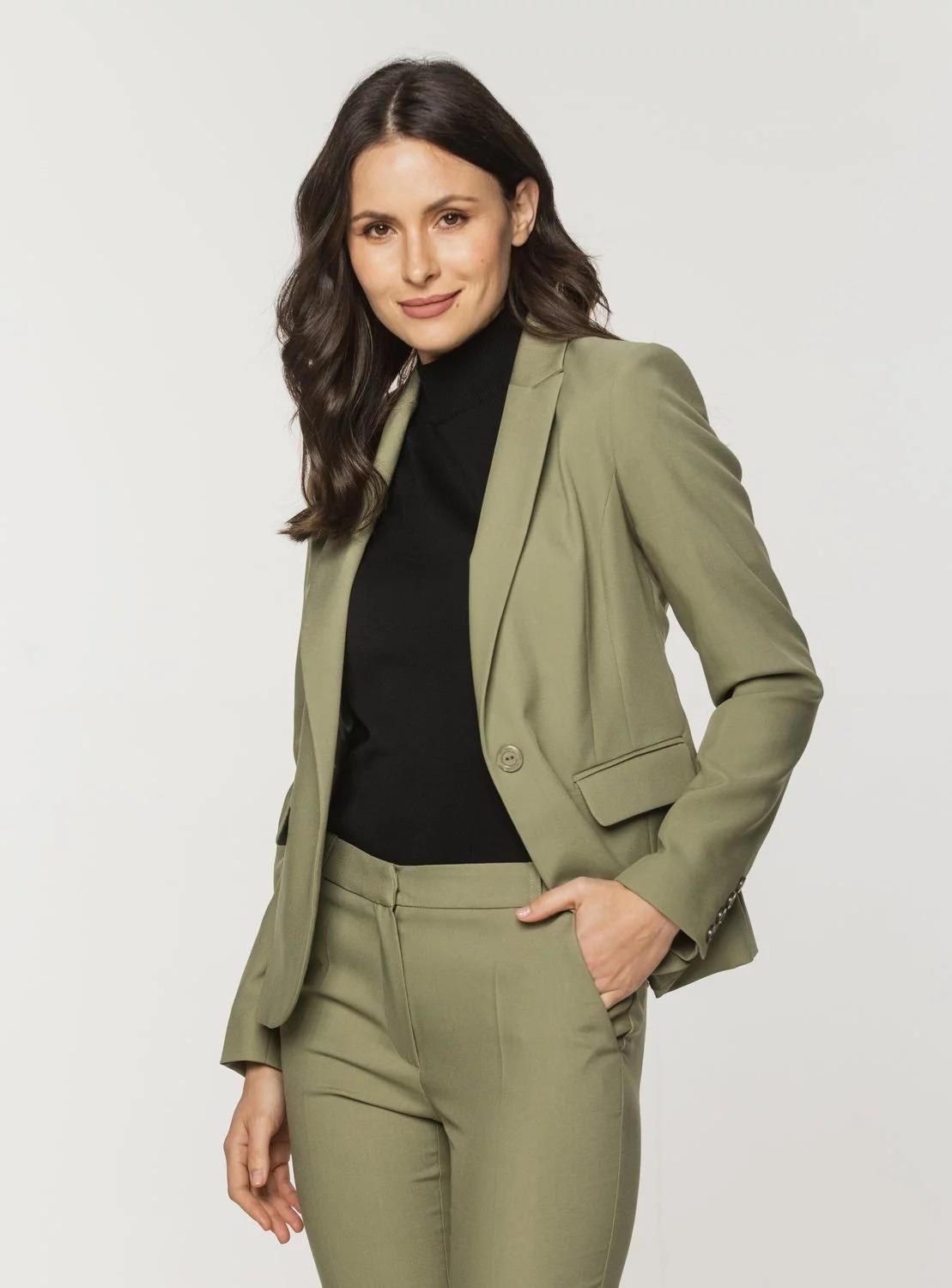 Marynarka damska Willsoor Wybierając elegancką, jednorzędową marynarkę damską marki Willsoor bez wątpienia przekonasz się do noszenia jej nie tylko od święta, ale również na co dzień! Marynarka jest lekka i wygodna, dzięki czemu nawet nie poczujesz, że masz na sobie tak niebywale elegancki strój. Została uszyta z wysokiej jakości materiału o gładkiej fakturze. Materiał jest elastyczny i delikatny w dotyku. Krój wyraźnie podkreśla linię talii. Guziki oraz kieszenie z patkami stylowo uzupełniają nowoczesny design marynarki. Tkanina: 37% wiskoza, 59% poliester, 4% elastan Skład podszewki: 94% poliester, 6% elastan Rodzaj marynarki: jednorzędowa, zapinana na jeden guzik Kolor główny: oliwkowa o gładkiej fakturze Producent: Willsoor Gwarancja: 24 m-ce Uszyta w Polsce