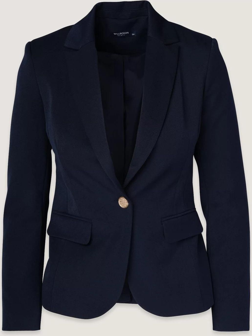 Marynarka damska Willsoor Wybierając elegancką, jednorzędową marynarkę damską marki Willsoor bez wątpienia przekonasz się do noszenia jej nie tylko od święta, ale również na co dzień! Marynarka jest lekka i wygodna, dzięki czemu nawet nie poczujesz, że masz na sobie tak niebywale elegancki strój. Została uszyta z wysokiej jakości materiału o gładkiej fakturze. Materiał jest elastyczny i delikatny w dotyku. Krój wyraźnie podkreśla linię talii. Guziki oraz kieszenie z patkami stylowo uzupełniają nowoczesny design marynarki. Tkanina: 24% wiskoza, 72% poliester, 4% elastan Skład podszewki: 98% poliester, 2% elastan Rodzaj marynarki: jednorzędowa, zapinana na jeden guzik (złoty, ozdobny) Kolor główny: granatowa o gładkiej fakturze Producent: Willsoor Gwarancja: 24 m-ce Uszyta w Polsce