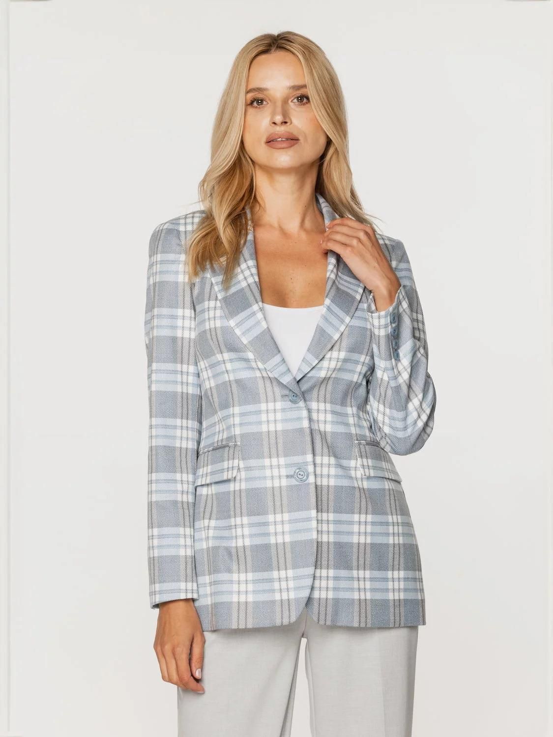 Marynarka damska Willsoor Wybierając elegancką, jednorzędową marynarkę damską marki Willsoor bez wątpienia przekonasz się do noszenia jej nie tylko od święta, ale również na co dzień! Marynarka jest lekka i wygodna, dzięki czemu nawet nie poczujesz, że masz na sobie tak niebywale elegancki strój. Została uszyta z wysokiej jakości materiału o gładkiej fakturze. Materiał jest elastyczny i delikatny w dotyku. Krój wyraźnie podkreśla linię talii. Guziki oraz kieszenie z patkami stylowo uzupełniają nowoczesny design marynarki. Tkanina: 80% poliester, 18% wiskoza, 2% Spandex Skład podszewki: 98% poliester, 2% elastan Rodzaj marynarki: jednorzędowa, zapinana na dwa guziki Kolor główny: szara, biała i błękitna krata Producent: Willsoor Gwarancja: 24 m-ce Uszyta w Polsce