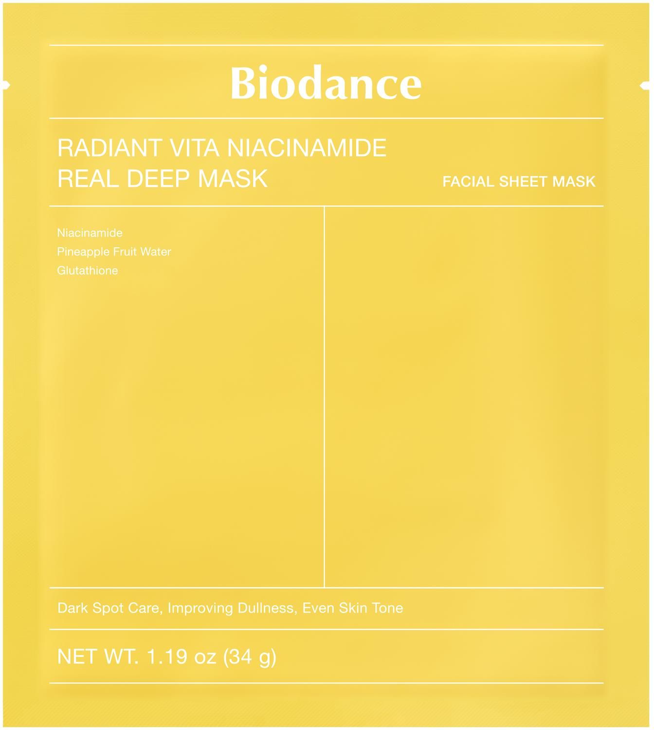 Biodance - Radiant Vita Niacinamide Real Deep Mask - hydrożelowa maseczka do twarzy, która składa się z dwóch części (na dolną i górną partię twarzy). Jest przeznaczona do stosowania na całą noc lub minimum 3-4 godziny. Zawarty w składzie kosmetyku niacynamid rozjaśnia przebarwienia oraz zwiększa jędrność i napięcie skóry. Dodatek betainy oraz kompleksu kwasu hialuronowego łagodzi podrażnienia i poprawia nawilżenie skóry, a adenozyna wspiera zmniejszenie widoczności drobnych zmarszczek mimicznych. Występująca w produkcie woda ananasowa wspiera wyrównywanie kolorytu skóry i zapewnia efekt glow. Receptura kosmetyku wzbogacona została także o glutation, który niweluje szkodliwe działanie wolnych rodników i wzmacnia rozjaśniające działanie produktu. Po wchłonięciu się w skórę aktywnej esencji maseczka staje się transparentna. Polecamy skórom z nierównomiernym kolorytem, matowym i bez blasku. Produkt zawiera: niacynamid - rozjaśnia przebarwienia, reguluje wydzielanie sebum, spłyca drobne zmarszczki, zwiększa jędrność oraz napięcie skóry, betainę - aminokwas, poprawia poziom nawilżenia skóry, łagodzi podrażnienia, wodę ananasową - wyrównuje koloryt skóry, wspomaga redukcję przebarwień, adenozynę - zmniejsza widoczność zmarszczek mimicznych, dzięki ograniczaniu skurczów włókien mięśniowych, zwiększa elastyczność i jędrność skóry, glutation - wspomaga ochronę skóry przed szkodliwym działaniem wolnych rodników, działa seboregulująco, rozjaśnia przebarwienia, kompleks kwasu hialuronowego - nawilża skórę, zapobiega powstawaniu zmarszczek, wykazuje właściwości łagodzące.