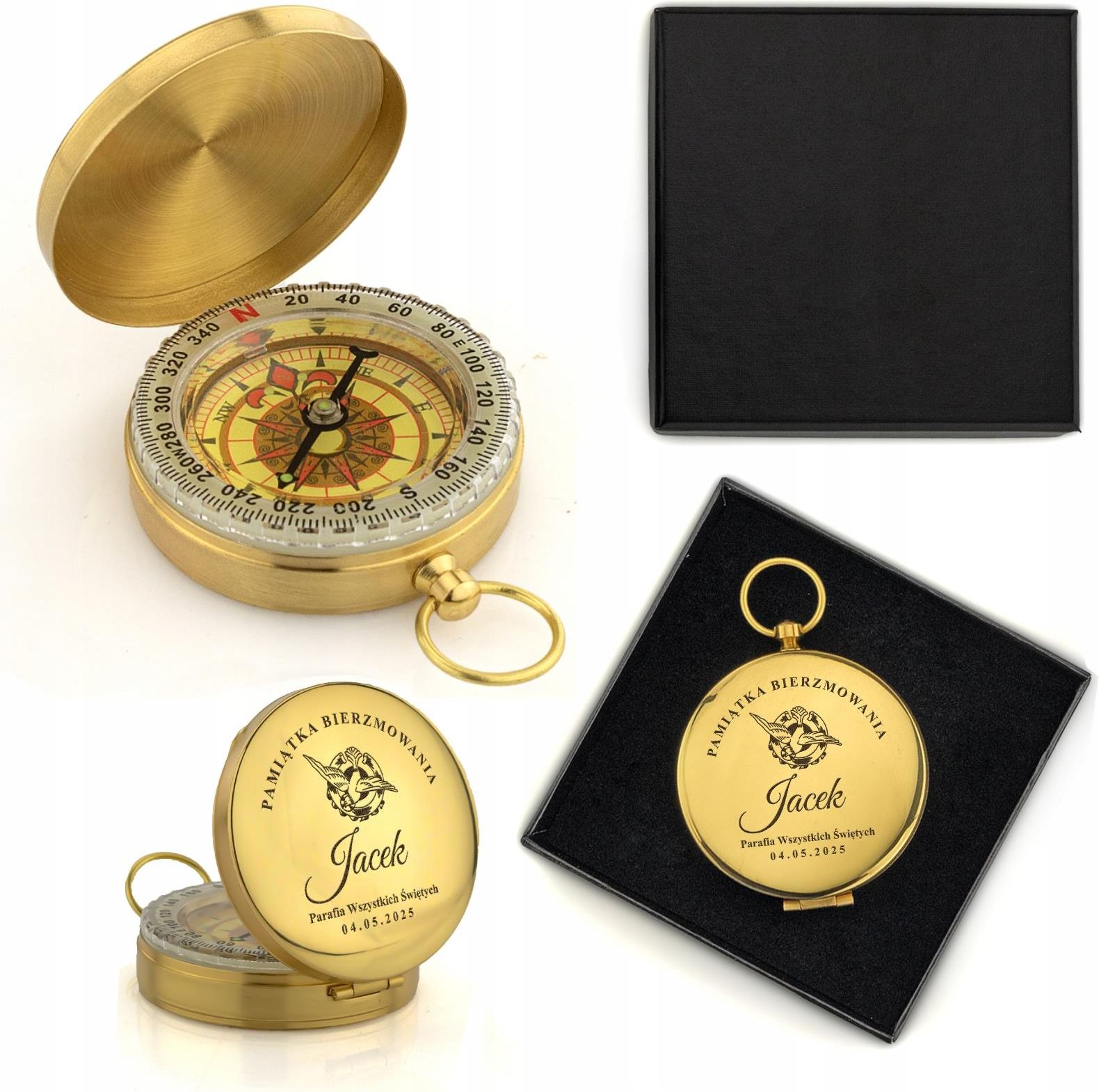 Mosiężny kompas z grawerem dedykacji Pamiątka Bierzmowania dla Chłopaka od świadka Wysoka jakość wykonania – Kompas wykonany z solidnego mosiądzu, gwarantującego trwałość i elegancki wygląd. Personalizowany grawer – indywidualna personalizacja, która sprawia, że prezent staje się wyjątkowy. Piękne opakowanie – Kompas zapakowany w eleganckie, solidne pudełko, które chroni go przed uszkodzeniami i stanowi piękne dopełnienie prezentu. Symboliczna pamiątka – Kompas jest nie tylko funkcjonalnym przedmiotem, ale także metaforą drogi duchowej i życiowej, co czyni go wyjątkowym upominkiem. Idealny na okazję Bierzmowania – Produkt stanowi doskonały wybór na pamiątkę tego wyjątkowego momentu, związanego z przejściem na wyższy etap duchowy. Elegancki design – Kompas ma klasyczny, ponadczasowy wygląd, który pasuje do każdego wnętrza i stylu. Kompas materiał: mosiądz wyjątkowy kompas dla podróżników tarcza jest fluorescencyjna średnica: 4,9 cm grubość: 1,4 cm WAŻNE; Kompas wykonany jest z metalu stylizowanego na antyczny, co nadaje mu unikalny charakter i wyjątkowy wygląd. Ze względu na zastosowane materiały (np. mosiądz, miedź lub ich stopy), z czasem może wystąpić naturalny proces patynowania lub zaśniedzenia powierzchni – zwłaszcza w przypadku długotrwałego przechowywania w zamkniętym pudełku, bez dostępu powietrza. Aby zachować estetykę i trwałość kompasu, zalecamy jego regularny przegląd oraz delikatną konserwację, np. przetarcie suchą, miękką ściereczką lub zastosowanie specjalnych preparatów do pielęgnacji metalu. Przechowywać w suchym miejscu, unikać wilgoci. Pudełko kolor: czarny wymiary: 8,5 x 8,5 x 2,5 cm wykonane z tektury Personalizacja Dane do personalizacji podaj w uwagach do zakupu. Zmianie na kompasie podlega imię chłopaka nazwa parafii lub podpis data