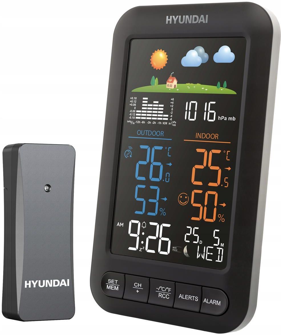 STACJA POGODY HYUNDAI WS5110 | ANIMOWANA PROGNOZA | TEMPERATURA I WILGOTNOŚĆ | BAROMETR | DCF 77 ⭐⭐⭐⭐⭐ Autoryzowany dystrybutor HYUNDAI w Polsce ✔️ 20 lat doświadczenia | ✔️ Polska instrukcja | ✔️ Serwis door-to-door Jesteśmy oficjalnym dystrybutorem i serwisantem marki HYUNDAI w Polsce. Kupując od nas masz pewność jakości i obsługi serwisowej. Kupujesz bezpośrednio od polskiego dystrybutora marki. ⭐⭐⭐⭐⭐ 🌦️ Hyundai WS5110 – czytelna kontrola pogody w domu i na zewnątrz Nowoczesna stacja pogody Hyundai WS5110 umożliwia bieżące monitorowanie warunków atmosferycznych wewnątrz i na zewnątrz budynku. Animowana prognoza pogody, pomiar temperatury i wilgotności, historia ciśnienia barometrycznego oraz funkcje czasu sprawiają, że wszystkie najważniejsze informacje masz zawsze w zasięgu wzroku. 🔍 Co wyróżnia Hyundai WS5110 Animowana prognoza pogody Pomiar temperatury i wilgotności (wewnątrz i na zewnątrz) Historia ciśnienia barometrycznego Zegar sterowany sygnałem radiowym DCF 77 Budzik, kalendarz i fazy Księżyca Pamięć wartości minimalnych i maksymalnych Obsługa do 3 czujników zewnętrznych Alarmy temperatury (wewnętrznej i zewnętrznej) 🌤️ Najważniejsze informacje pogodowe na pierwszy rzut oka Czytelny wyświetlacz prezentuje aktualne warunki oraz animowaną prognozę pogody, dzięki czemu szybko ocenisz sytuację za oknem. Jednoczesny pomiar temperatury i wilgotności pozwala lepiej zadbać o komfort domowników oraz mikroklimat pomieszczeń. 📉 Barometr i zmiany pogodowe Wbudowany barometr umożliwia obserwację zmian ciśnienia atmosferycznego w czasie. Historia pomiarów ułatwia przewidywanie nadchodzących zmian pogody, takich jak ochłodzenie, opady czy stabilna aura. ⏰ Dokładny czas i funkcje codzienne Zegar sterowany sygnałem DCF 77 ustawia się automatycznie, zapewniając precyzyjne wskazania czasu. Dodatkowo stacja oferuje: ⏰ budzik, 📅 kalendarz, 🌙 fazy Księżyca. 📡 Elastyczność dzięki czujnikom Stacja może współpracować jednocześnie z maksymalnie trzema bezprzewodowymi czujnikami zewnętrznymi (kompatybilny model: HYUWSSENZOR52). Umożliwia to monitorowanie warunków w kilku lokalizacjach, np. w ogrodzie, garażu lub innym pomieszczeniu. 🛡️ Komfort i bezpieczeństwo Alarmy ostrzegające o przekroczeniu ustawionych temperatur Odczyt temperatury i wilgotności w czasie rzeczywistym Stabilna komunikacja bezprzewodowa z czujnikami 📦 Zestaw zawiera Stację pogodową Hyundai WS5110 Czujnik zewnętrzny Polska instrukcja obsługi ⚙️ Parametry techniczne Typ urządzenia: stacja pogody Prognoza pogody: animowana Pomiar: temperatura i wilgotność (wewnętrzna / zewnętrzna) Barometr: tak, z historią zmian Zegar: radiowy DCF 77 Funkcje dodatkowe: budzik, kalendarz, fazy Księżyca Obsługa czujników: do 3 zewnętrznych Zasilanie czujników: 2× AA (brak w zestawie) ❓ FAQ – najczęściej zadawane pytania Czy stacja pokazuje temperaturę na zewnątrz i wewnątrz? ✔️ Tak, jednocześnie mierzy temperaturę i wilgotność w obu lokalizacjach. Czy czas ustawia się automatycznie? ✔️ Tak, dzięki sygnałowi radiowemu DCF 77. Ile czujników można podłączyć? ✔️ Maksymalnie trzy kompatybilne czujniki zewnętrzne. Czy można sprawdzić historię pogody? ✔️ Tak, stacja zapisuje historię ciśnienia barometrycznego oraz wartości min./max. Czy czujniki są bezprzewodowe? ✔️ Tak, komunikują się bezprzewodowo ze stacją bazową.