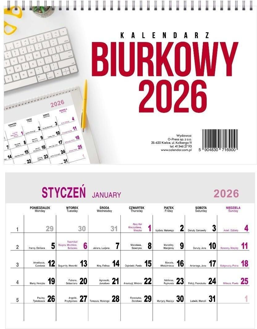 Kalendarz 2026 na biurko miesięczny O-PRESS stojący na spirali Szczucin