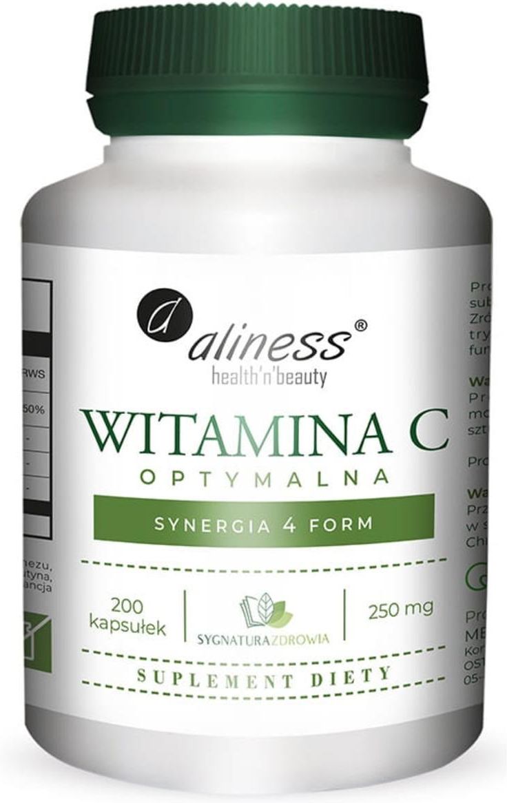 Aliness Witamina C optymalna 250 mg 200 vege kapsułek Witamina C optymalna, 200 kapsułek suplement diety Synergia 4 form Działanie witaminy C przyczynia się do prawidłowego funkcjonowania układu odpornościowego pomaga w prawidłowej produkcji kolagenu w celu zapewnienia prawidłowego funkcjonowania, …