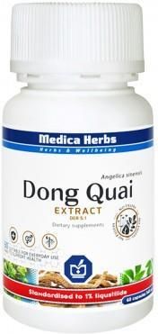 DONG QUAI 5:1 Ekstrakt pozyskany z korzenia Angelica sinensis, standaryzowany do 1% ligustylidu (Drug Extract Ratio - 5:1). - suplement diety - 540 mg / 60 kapsułek DONG QUAI czyli Angelica sinensis jest powszechnie stosowany w celu wspierania prawidłowego stanu zdrowia i dobrego samopoczucia kobiet. Dzięki wysokiej zawartości ligustylidu na poziomie 1%, suplement wspiera utrzymanie równowagi hormonalnej, przez co wspomaga prawidłowe działanie układu moczowo-płciowego oraz prawidłową zdolność reprodukcyjną kobiet. Produkt ma zastosowanie przy łagodzeniu objawów miesiączki i menopauzy. Produkty ziołowe firmy Medica Herbs SĄ TESTOWANE ANALITYCZNIE w celu zapewnienia stałego stężenia składników aktywnych oraz skuteczności działania. PREZENTOWANY PRODUKT JEST POTWIERDZONY JAKOŚCIOWO. SKŁADNIKI 1 KAPSUŁKI: Ekstrakt pozyskany z korzenia Angelica sinensis, standaryzowany do 1% ligustylidu (Drug Extract Ratio - 5:1), żelatyna (kapsułka). SPOSÓB UŻYCIA: (dorośli) 1 kapsułka dwa razy dziennie. Nie przekraczać zalecanej porcji do spożycia w ciągu dnia. Produkt nie może być stosowany jako substytut prawidłowo zróżnicowanej diety. PRZECIWWSKAZANIA: Produkt nie wskazany dla kobiet w ciąży i karmiących. PRZECHOWYWANIE: Przechowywać w temperaturze pokojowej, w sposób niedostępny dla małych dzieci. OPAKOWANIE: 540 mg / 60 kapsułek . WAGA NETTO: 32,4 g INFORMACJE O PRODUCENCIE: Medica Herbs dbając o satysfakcję swoich klientów wykorzystuje tylko wysokiej klasy surowce. Dla zapewnienia bezwzględnej jakości surowców, każda partia poddawana jest kontroli organoleptycznej oraz analitycznej. Firma stara się aby najwyższa jakość produktów była oferowana w przystępnych cenach. Czystość i jakość produktów Medica Herbs jest CERTYFIKOWANA PRZEZ NIEZALEŻNE LABOLATORIUM - lidera jakości na światowym rynku badań sektora farmaceutycznego, suplementów diety oraz żywności. Wszystkie produkty spełniają kryteria zawarte w rozporządzeniu Farmakopea Europejska 6.0 oraz spełniają standardy GMP i HACCP, zgodnie z normami UE.