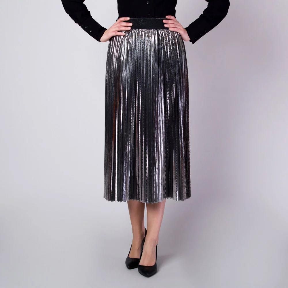Elegancka spódnica plisowana Spódnica plisowana z połyskiem w uniwersalnym i praktycznym rozmiarze midi. Posiada elastyczną gumę w pasie, która świetnie modeluje sylwetkę. Dobrze komponuje się z bluzką lub swetrem wpuszczonym do środka. - Kolor: srebrna - Typ: plisowana, rozkloszowana - Wykończenia: czarna guma w pasie - Długość spódnicy: 78 cm - Obwód gumy w pasie: 62 cm przed rozciągnięciem - Tkanina: 100% poliester - Wyprodukowano w UE - Gwarancja: 24 m-ce - Zalecenia: prać ręcznie, nie wirować
