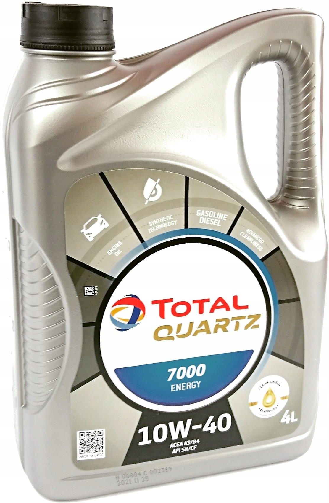Olej silnikowy Total Quartz 7000 Energy 10W-40 4L Olej silnikowy Total Quartz 7000 Energy to półsyntetyczny olej silnikowy 5W-40 o pojemności 4L. Dzięki specjalnej formule olej jest dopasowany do najnowszych rozwiązań technicznych w silnikach benzynowych i diesla większości producentów. Zastosowanie oleju silnikowego Total Quartz 7000 Energy 5W-40 Olej silnikowy Total Quartz 7000 Energy 5W-40 przeznaczony jest do stosowania w pojazdach wyposażonych w silniki benzynowe i wysokoprężne najnowszej konstrukcji: ielozaworowych, wolnossących i turbodoładowanych, z wałkami rozrządu w głowicy, zasilanych benzyną bezołowiową, a także gazem LPG. Normy, aprobaty, specyfikacje ACEA C1, C2 PSA B71 2312, PSA B71 2302 (Peugeot i Citroen) STJLR.03.5007 (Jaguar i Land Rover) Spełnia wymagania marki: Toyota