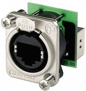 NEUTRIK NE8FDP-B gniazdo tablicowe RJ45 ETHERCON Profesjonalne, solidnie wykonane, gniazdo tablicowe RJ45 etherCON marki NEUTRIK. Seria etherCON to system złączy zapewniający mocne połączenie w każdych warunkach. Złącza z systemem blokowania zoptymalizowane pod kątem użytkowania w mobilnych, profesjonalnych instalacjach audio, wideo i sieciowych. Skonstruowane tak, by pasowały także do standardowych złączy RJ45. Gniazdo kompatybilne z wtykami NE8MC dostępnymi na innych naszych aukcjach. Dane techniczne Złącze: RJ45 kat.5e Styki pozłacane (0,2 µm Au) Styki: brąz (CuSn8) Zakres częstotliwości: 1 – 100 Mhz Obciążalność prądowa pojedynczego wtyku: 1,5 A Rezystancja złącz: < 10 mΩ Rezystancja izolacji: > 0,5 GΩ Odporność napięciowa dielektryka: 1 kVdc Obudowa: czarny Temperatura pracy: -30°C do + 80°C Rysunek techniczny Neutrik to międzynarodowa korporacja z ponad 40-letnim doświadczeniem w produkcji innowacyjnych produktów oraz systemów elektrycznych i elektronicznych. Obecnie Neutrik jest światowym lider w projektowaniu, produkcji i sprzedaży profesjonalnych złącz audio i wideo. Doskonały stosunek ceny do wydajności, atrakcyjny wygląd, niezawodność i funkcjonalność to główne atuty marki. Firma jest ceniona przez realizatorów, muzyków i właścicieli studiów nagraniowych. Inżynierowie dbają o najwyższą jakość wyrobów. Sprzęt audio i instalacje dźwiękowe z wykorzystaniem złączy tej marki cechuje pewność połączenia i bardzo wysoka niezawodność. Galeria przykładowych zastosowań produktów Neutrik