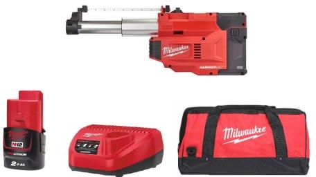 M12 UDEL-201B | M12™ ODSYSACZ UNIWERSALNY Pasuje do wszystkich młotów MILWAUKEE® SDS-plus oraz do większości konkurencyjnych produktów z szyjką przekładni o średnicy 41-61 mm z jednym regulowanym uchwytem bocznym, z możliwością montażu po prawej lub lewej stronie młota Wydajność - ponad 40 min. pracy na jednym ładowaniu akumulatora M12 2.0 Ah Dzięki teleskopowej dyszy, możliwość używania z wiertłami SDS-plus o długości do 210 mm Regulowany miernik głębokości wiercenia w celu perfekcyjnego dopasowania do konkretnego zadania 2 wymienne dysze ze szczotkami do odsysania otworów o średnicach do ⌀30 mm ( ⌀5-16 mm, ⌀16-30 mm) 2 różne tryby podciśnienia, umożliwiające włączenie urządzenia na stałe lub włączanie automatyczne w momencie rozpoczęcia wiercenia Automatyczna 5-sekundowa zwłoka wyłącznika w celu całkowitego usunięcia pyłu z otworu Wyposażony w filtr klasy HEPA H13, jak również mechanizm czyszczenia filtra zapewniający najlepszą wydajność i dłuższą żywotność filtra Wyposażony w przezroczysty zbiornik zapewniający doskonałą widoczność napełnienia, a także złącze podciśnieniowe ⌀32 mm do opróżniania pojemnika na kurz bez narażania na jego działanie Wskaźnik wyświetlacza pokazuje stan ładowania akumulatora    .